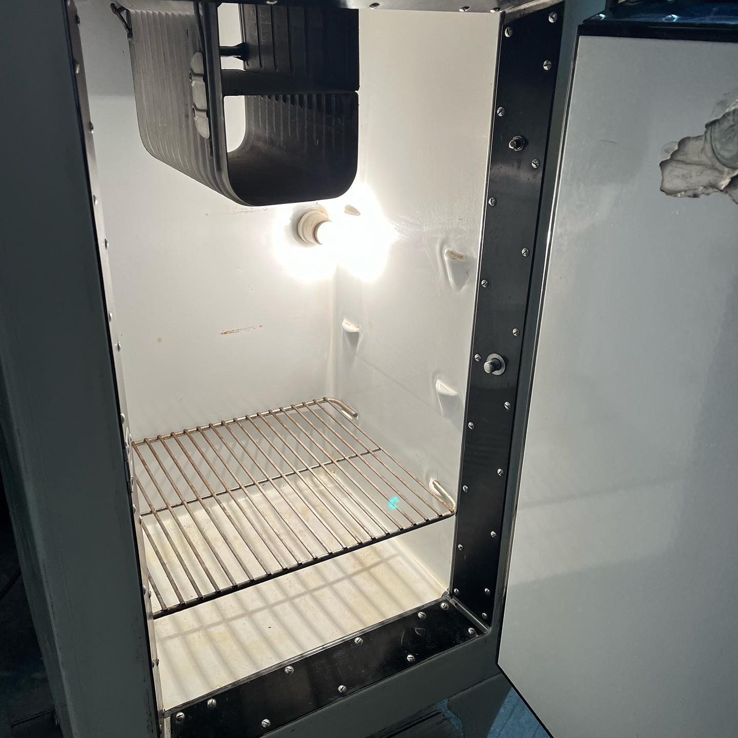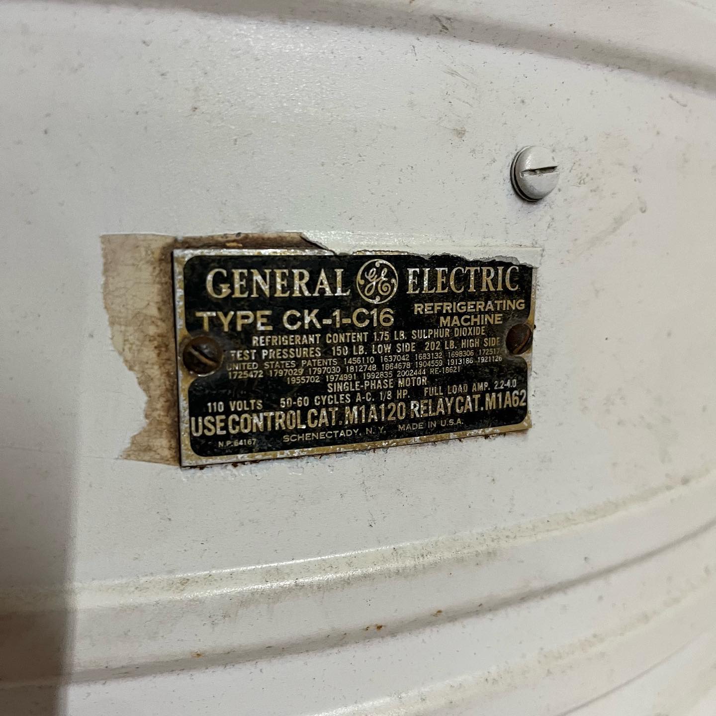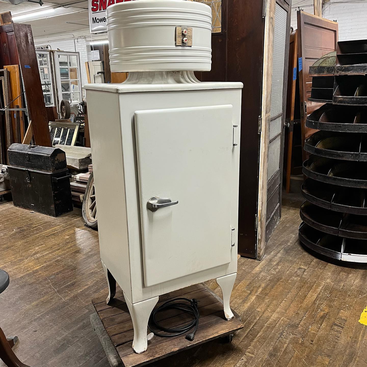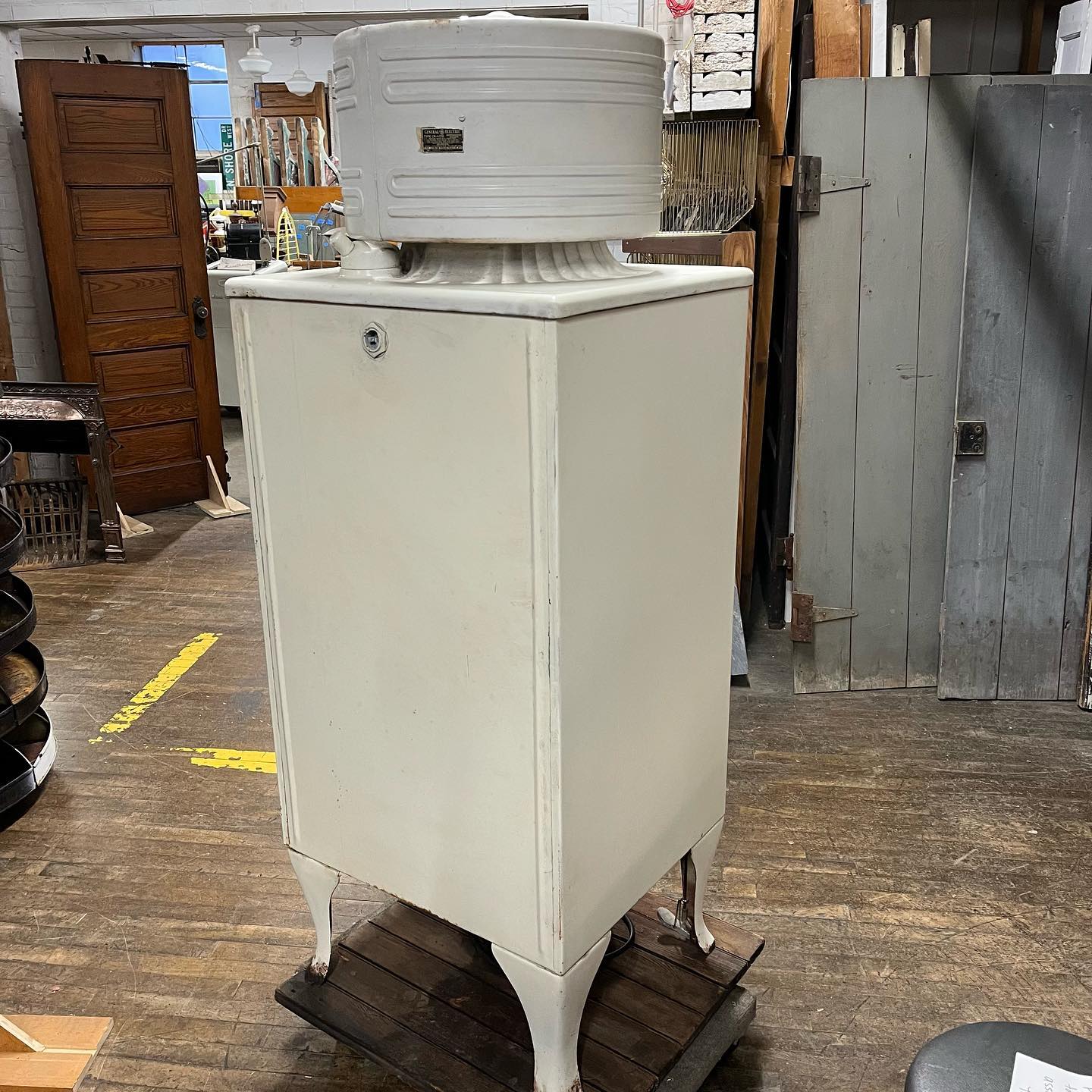 1930’s GE monitor top refrigerator. Non-working, but the light works. There’s even a foot pedal that opens the door. Repurpose into wine/liquor storage or a pantry!
