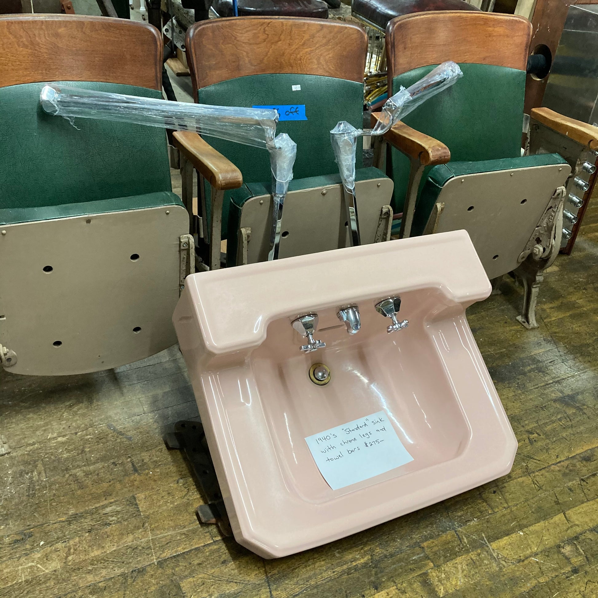 1940s "Standard" pink sink with chrome legs and towel bars.