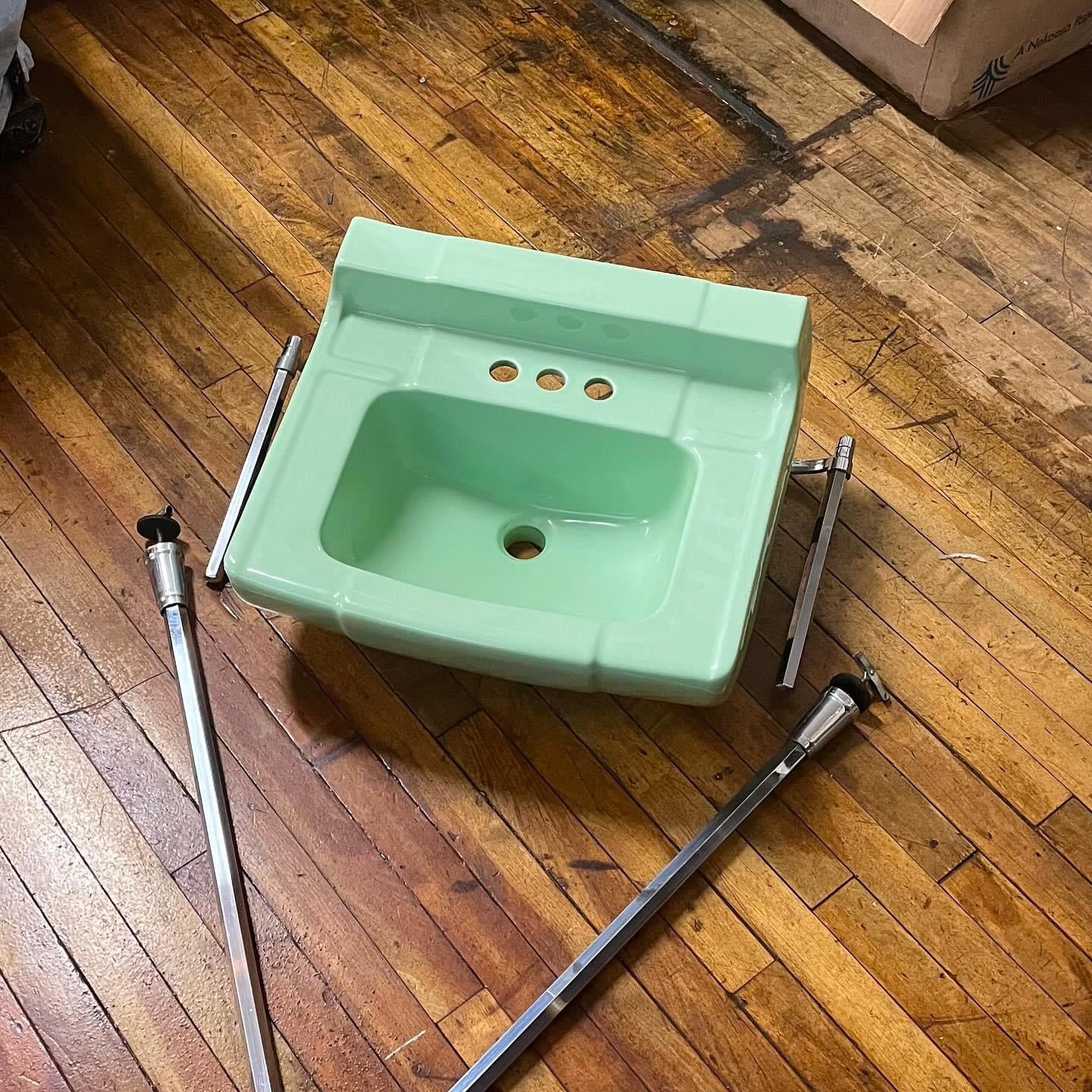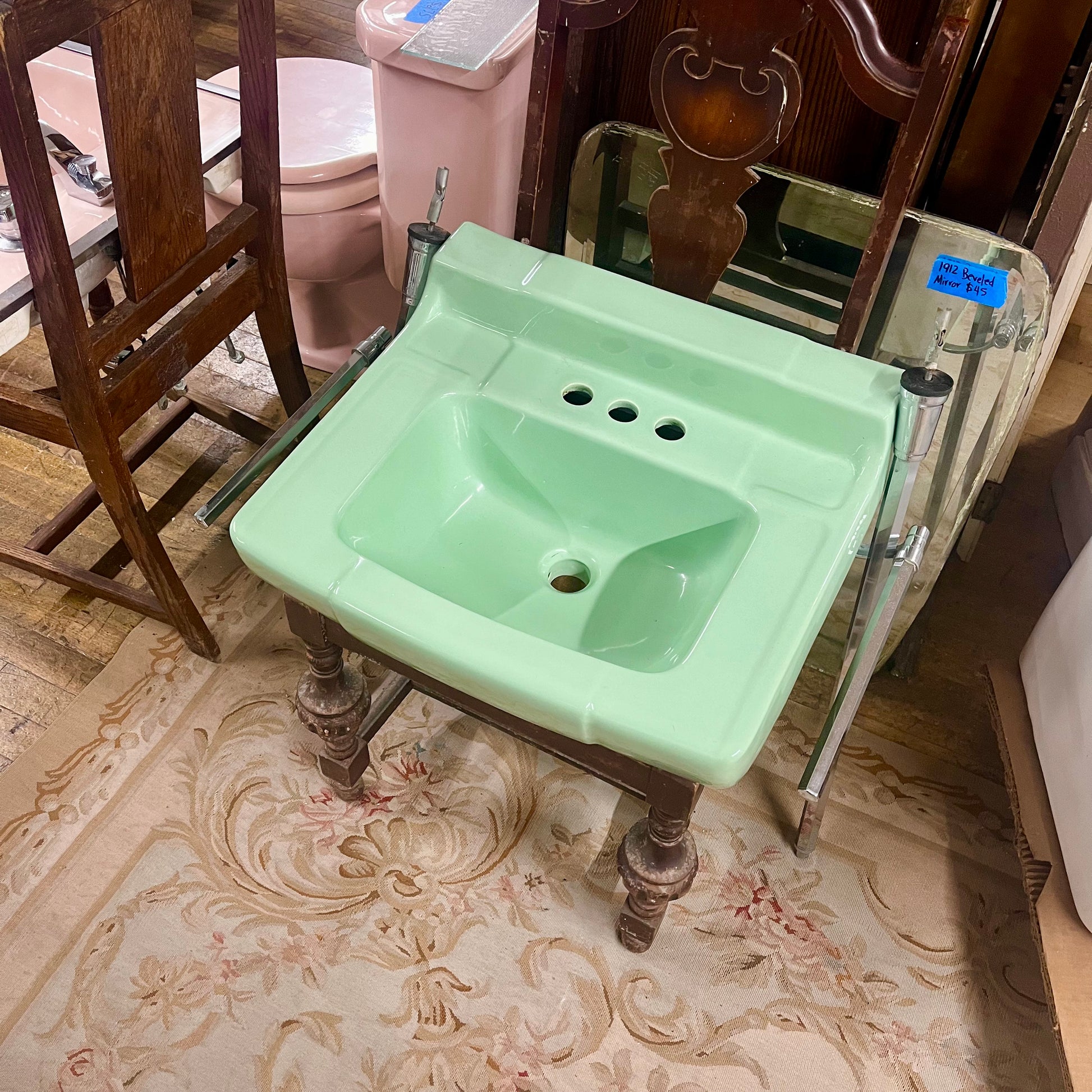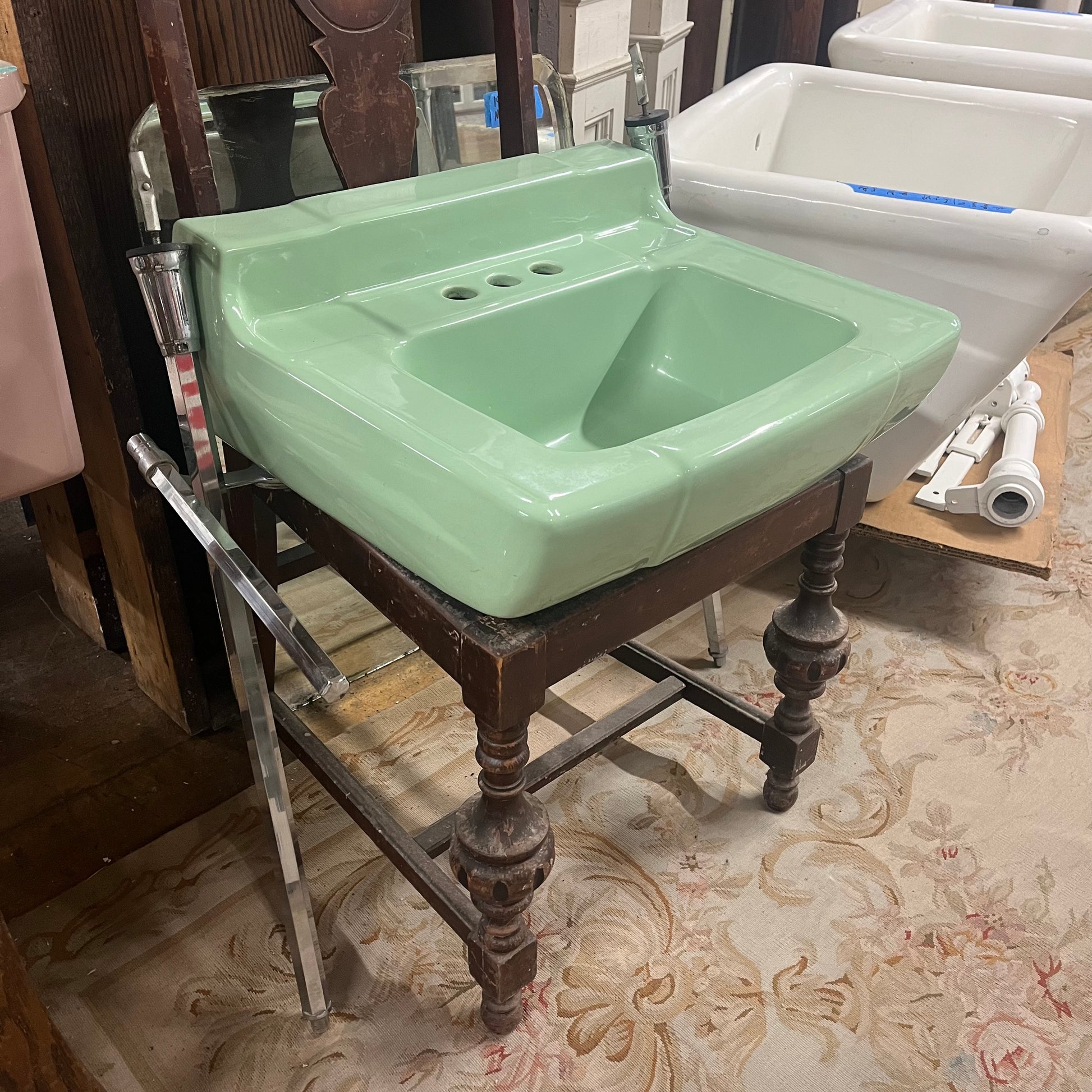 Stunning mint green or jadeite green (pictures do not do the color justice) bathroom sink with original chrome legs and towel bars. No chips or cracks, in good condition for age. Chrome legs and towel bars have cosmetic wear typical for age, but overall in great shape.