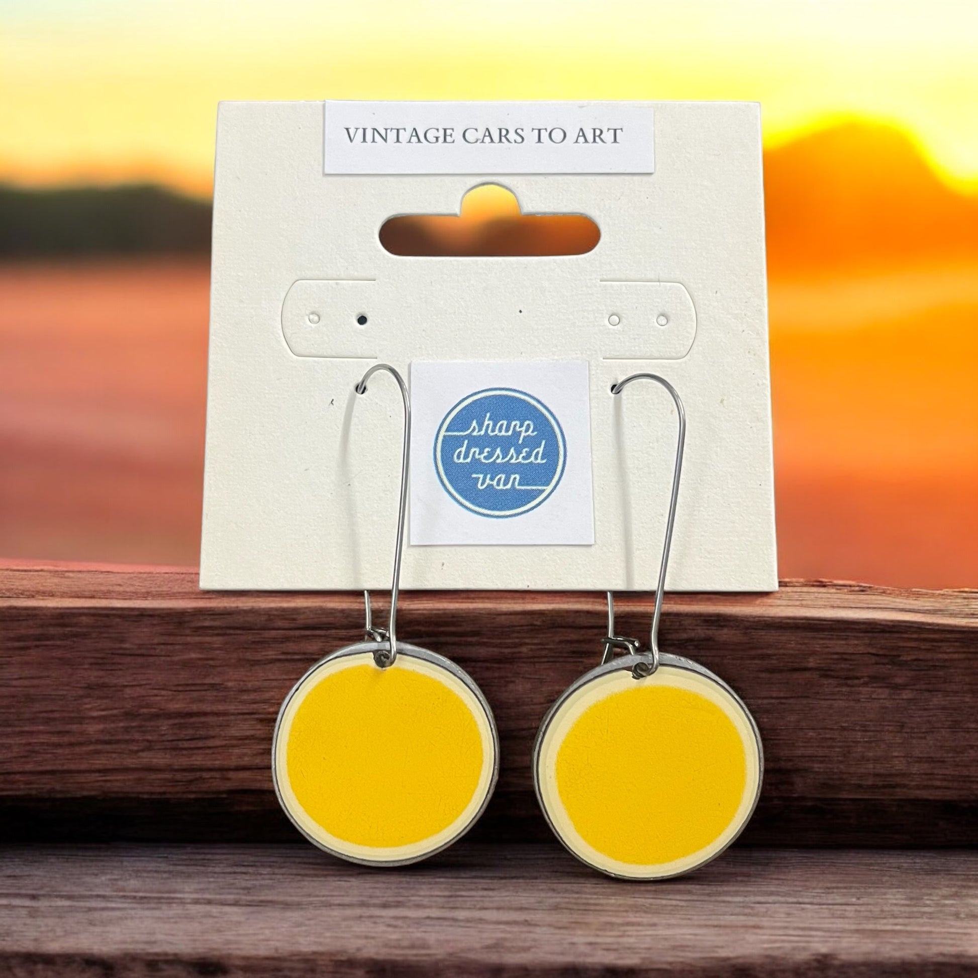 Metal earrings hand-crafted out of vintage car metal - 1960s Dodge. Original color.