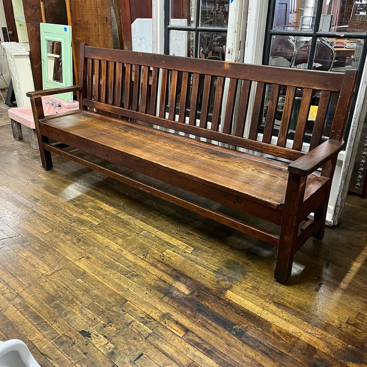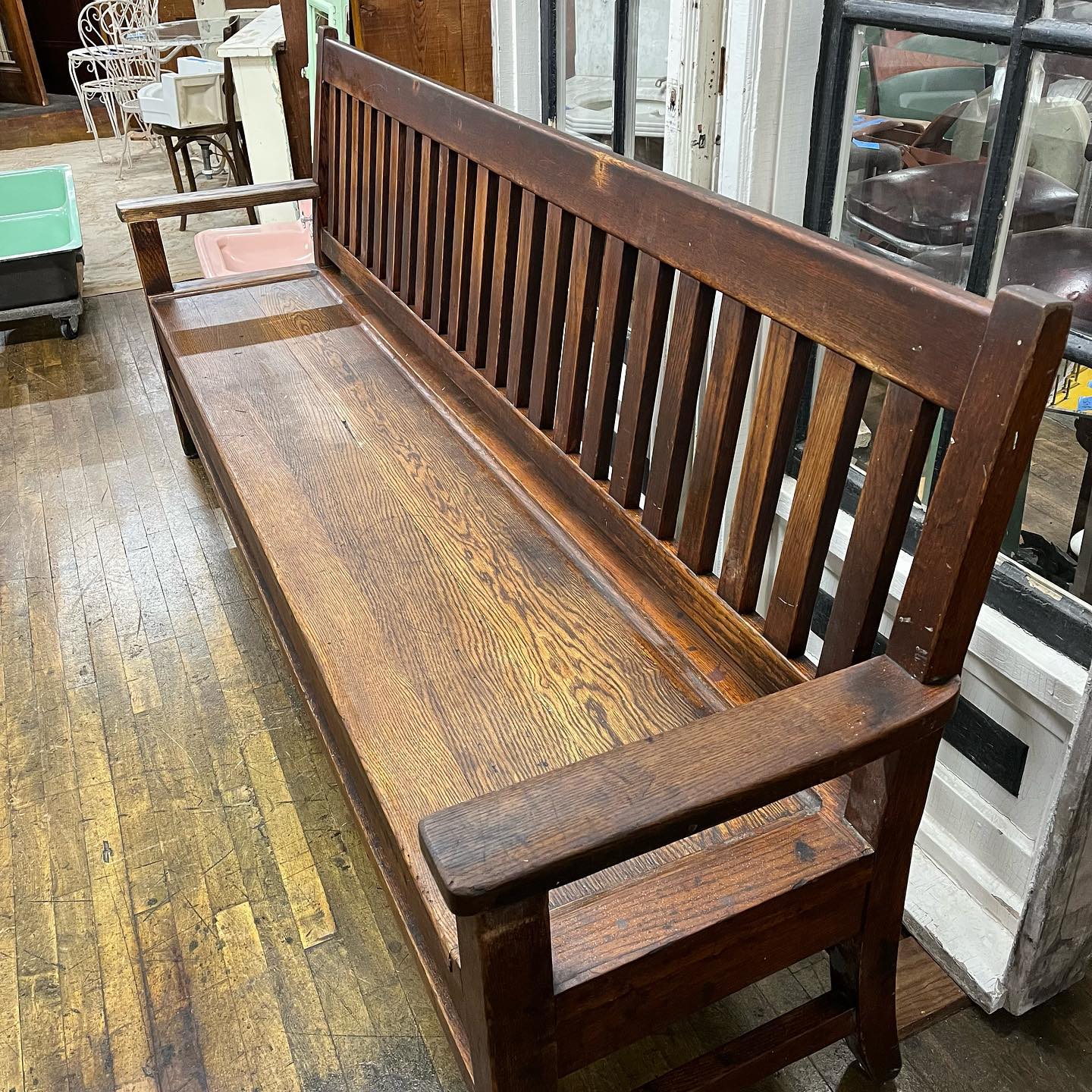 Antique 8 ft oak slotted back bench.