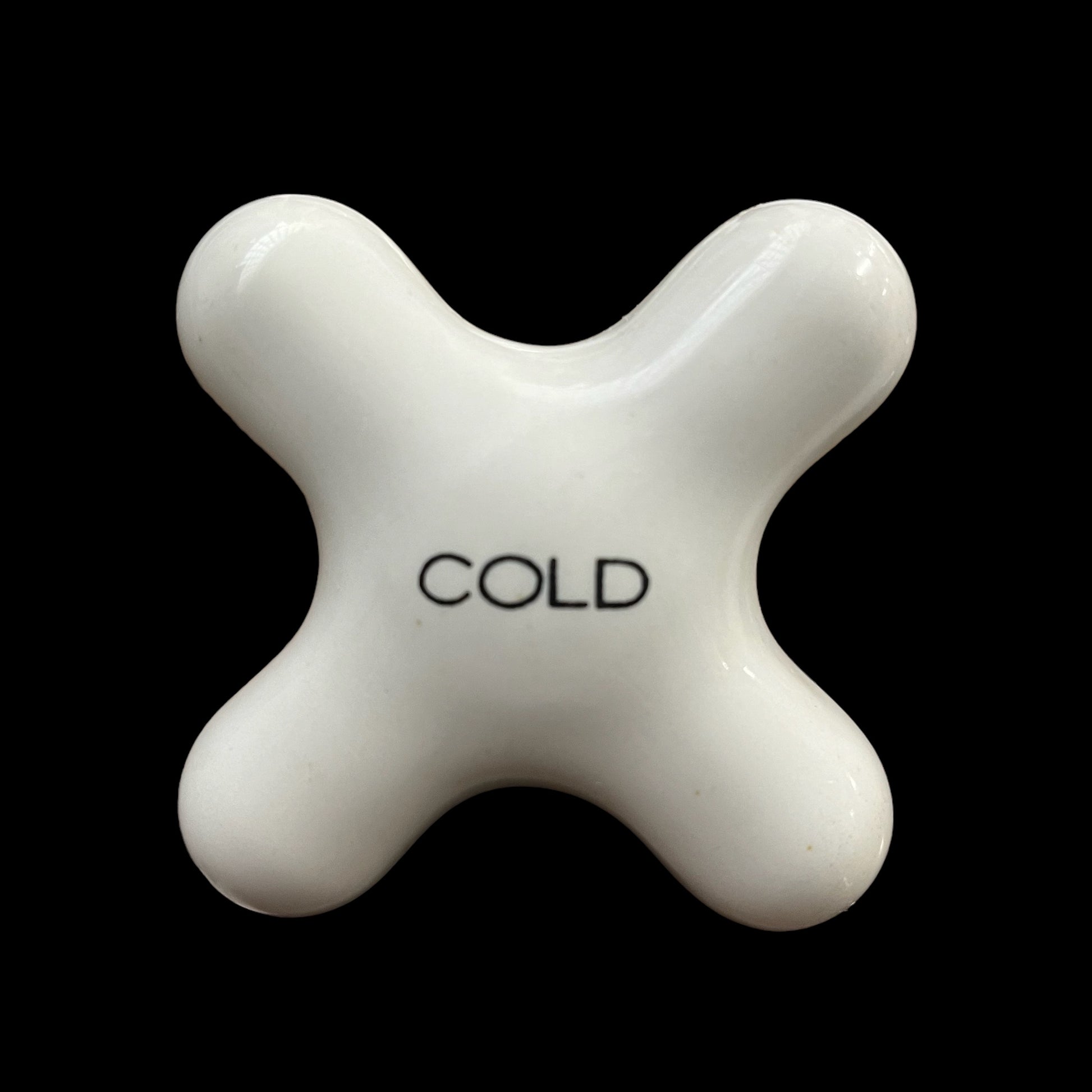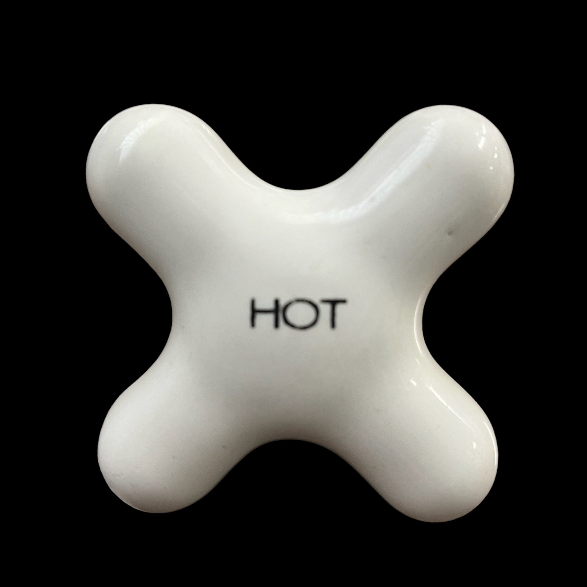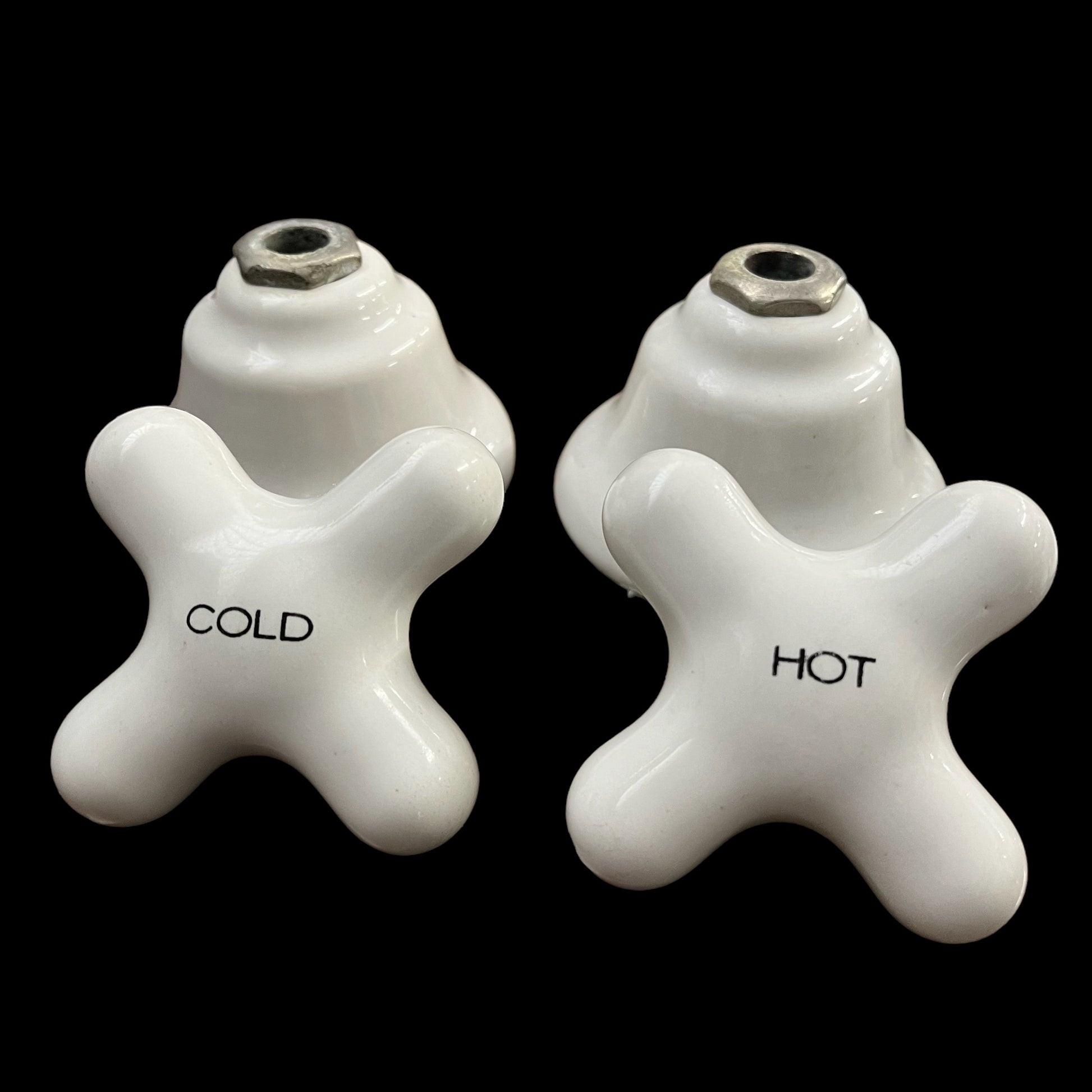 Antique (c. 1920) white porcelain COLD and HOT tub/shower faucet knobs with porcelain escutcheons. Set includes one COLD knob, one HOT knob, and two escutcheons.