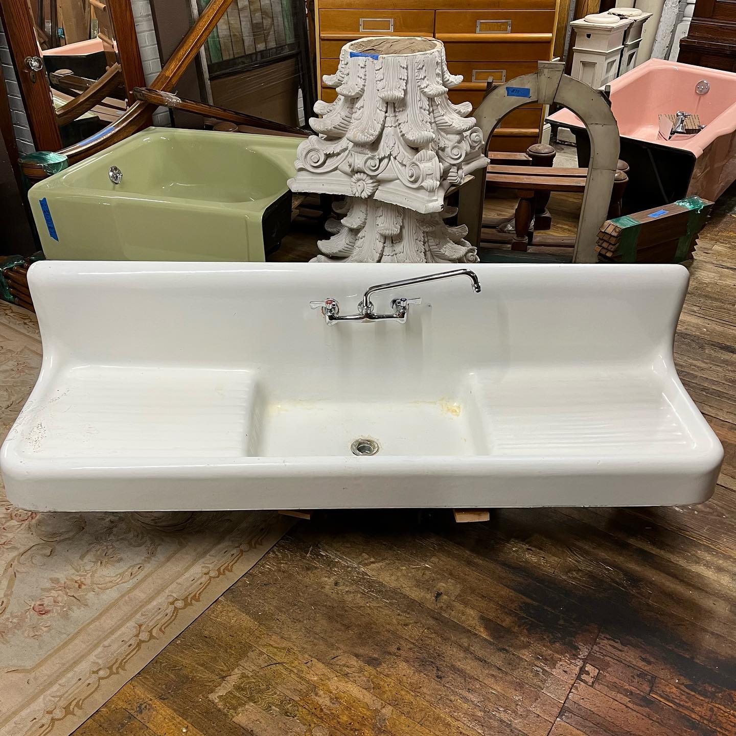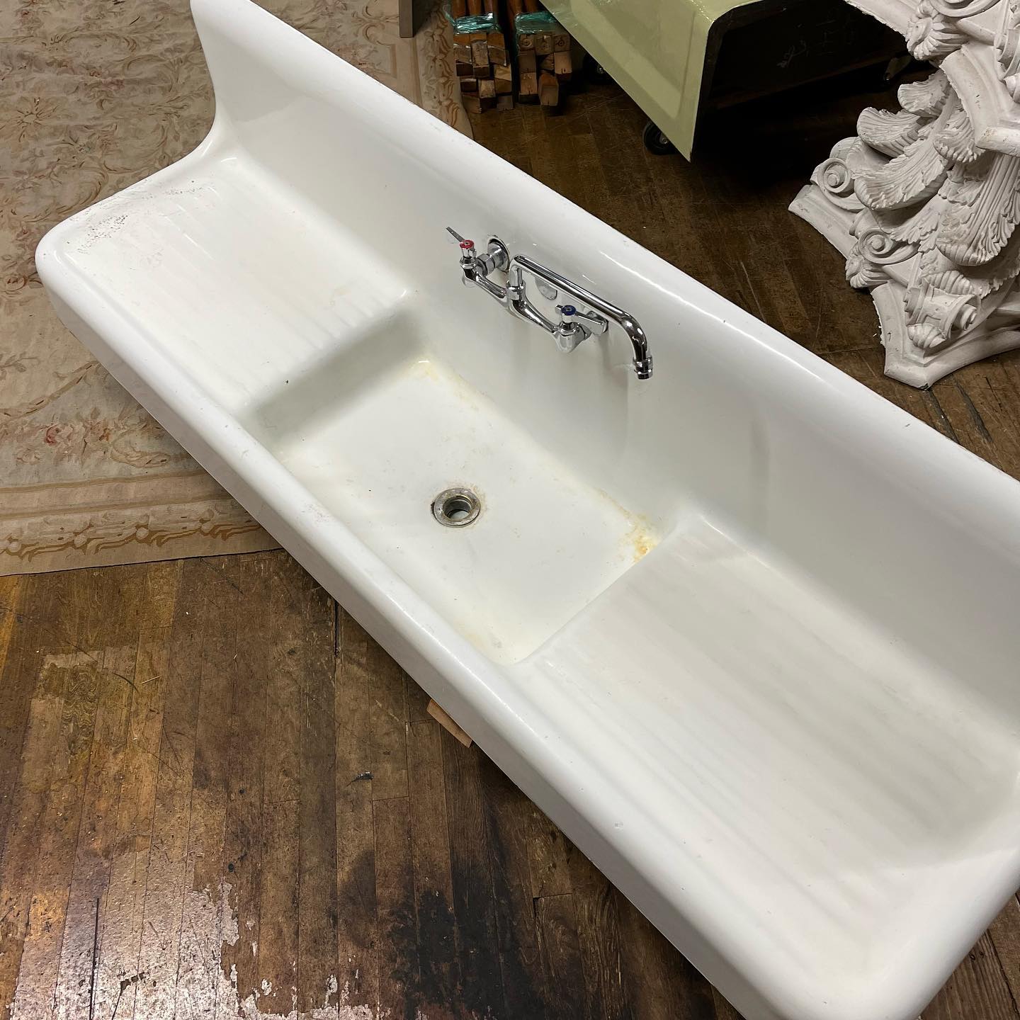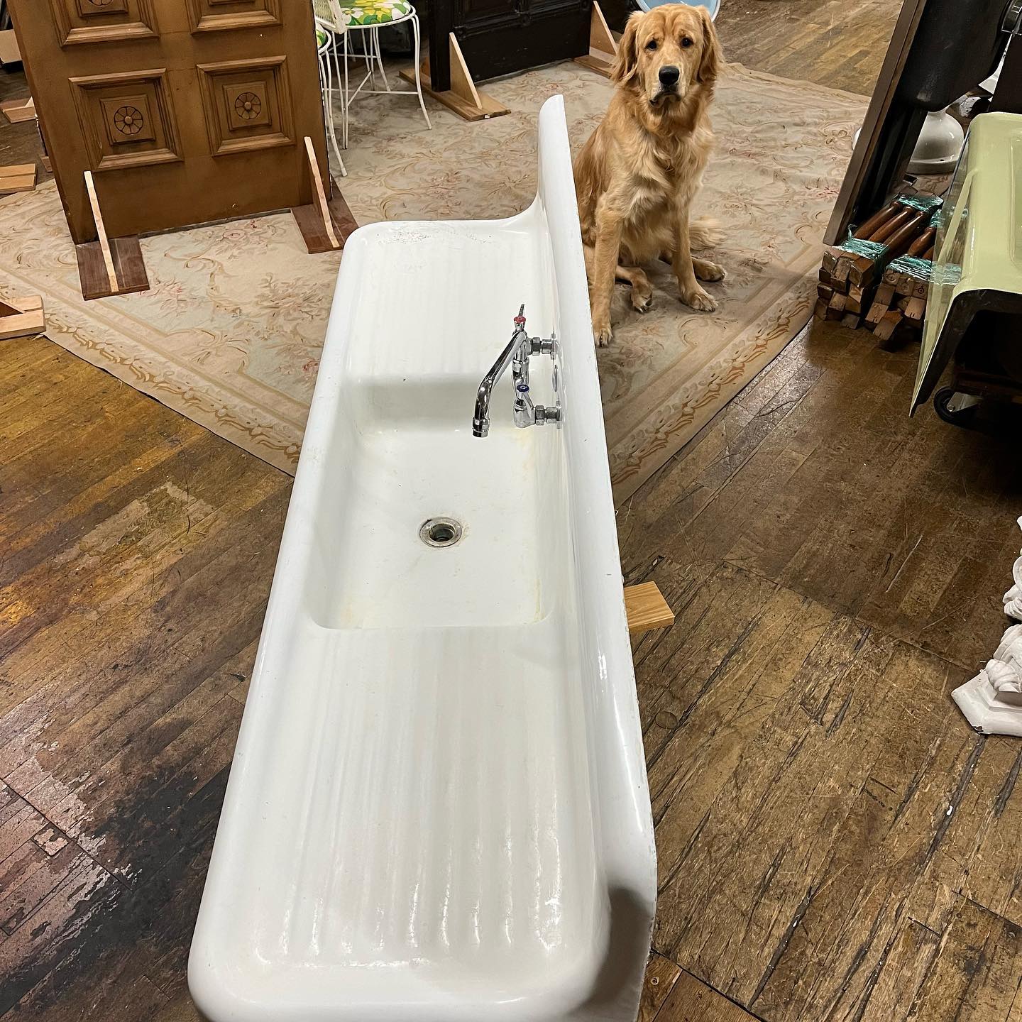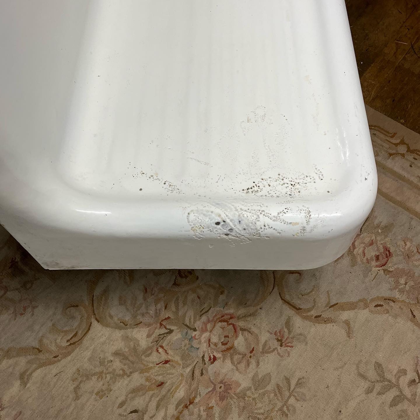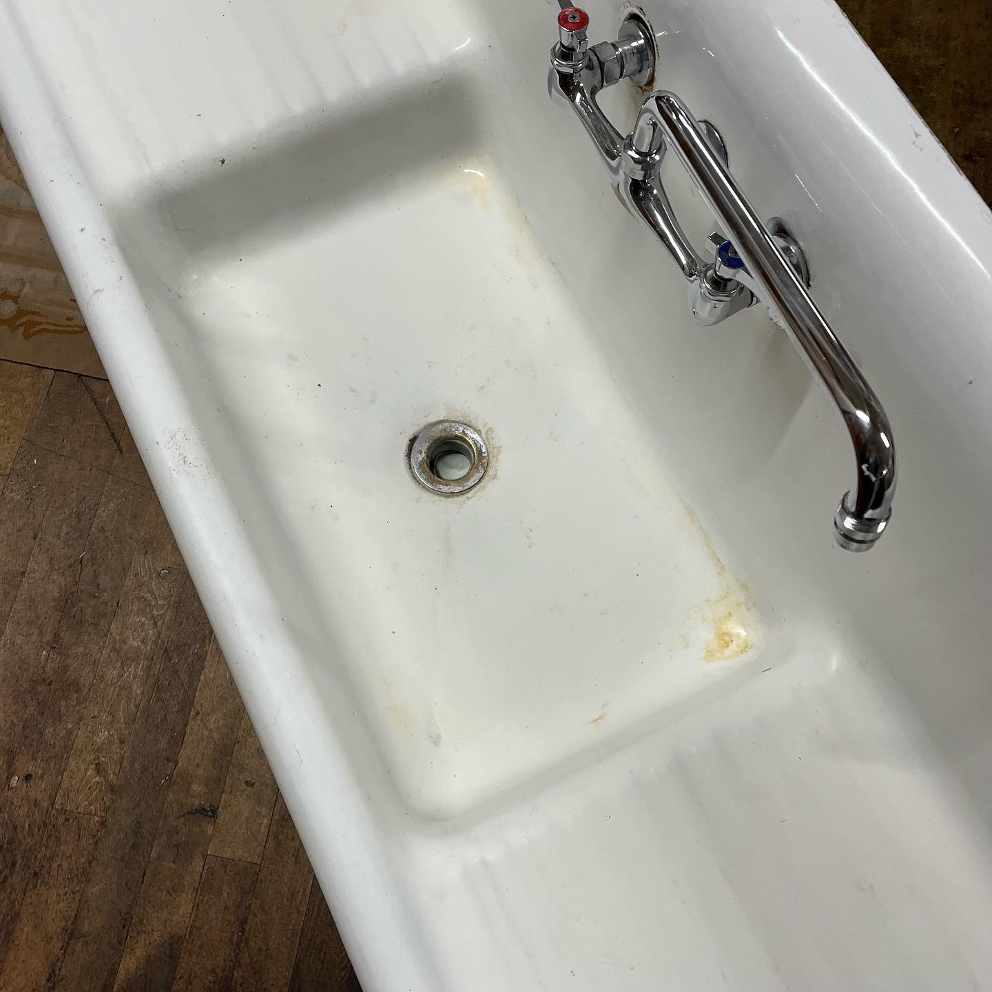 6 ft antique cast iron farm sink! Overall good condition for age. Has some pitting with porcelain on left end (see in pics). We have the 2 original wall mount brackets.