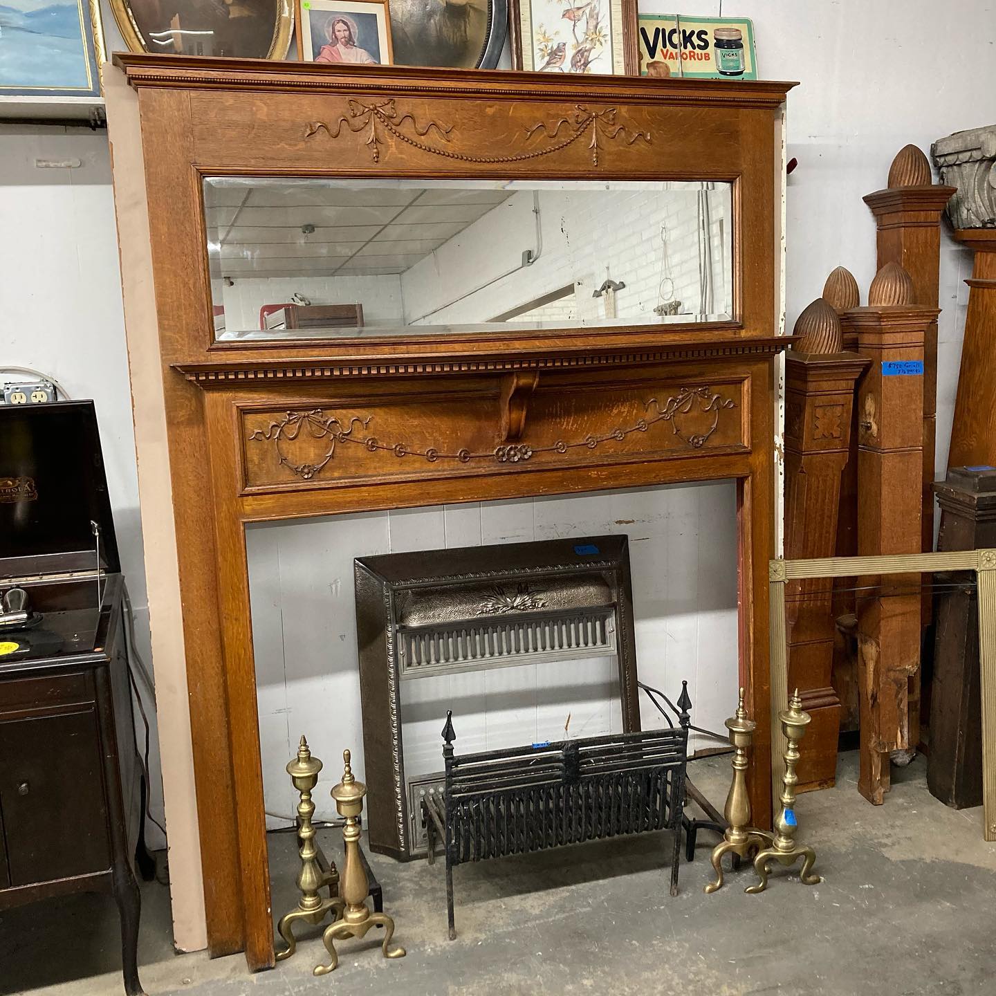 Antique oak fireplace mantel/surround with original beveled mirror and woodwork detail.
