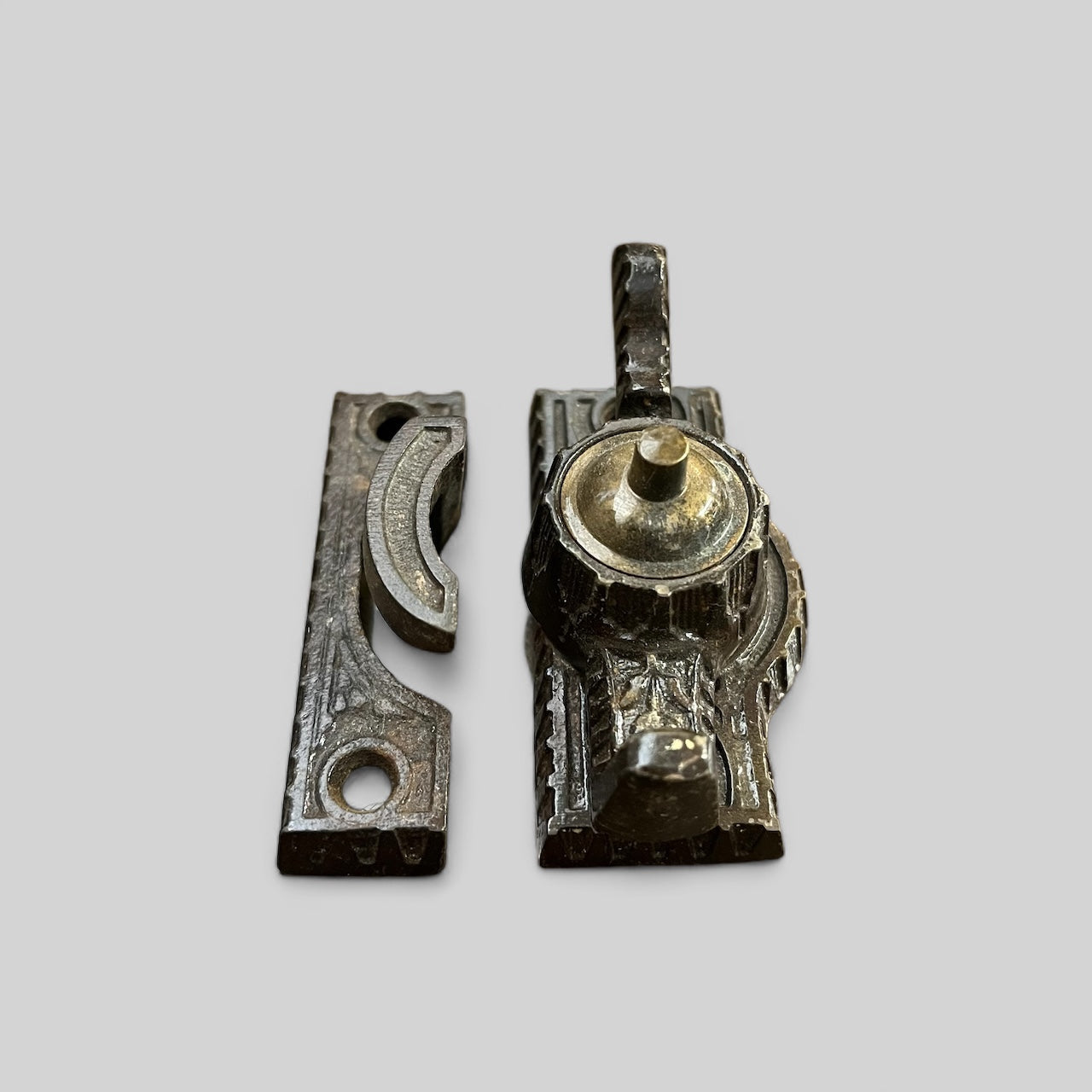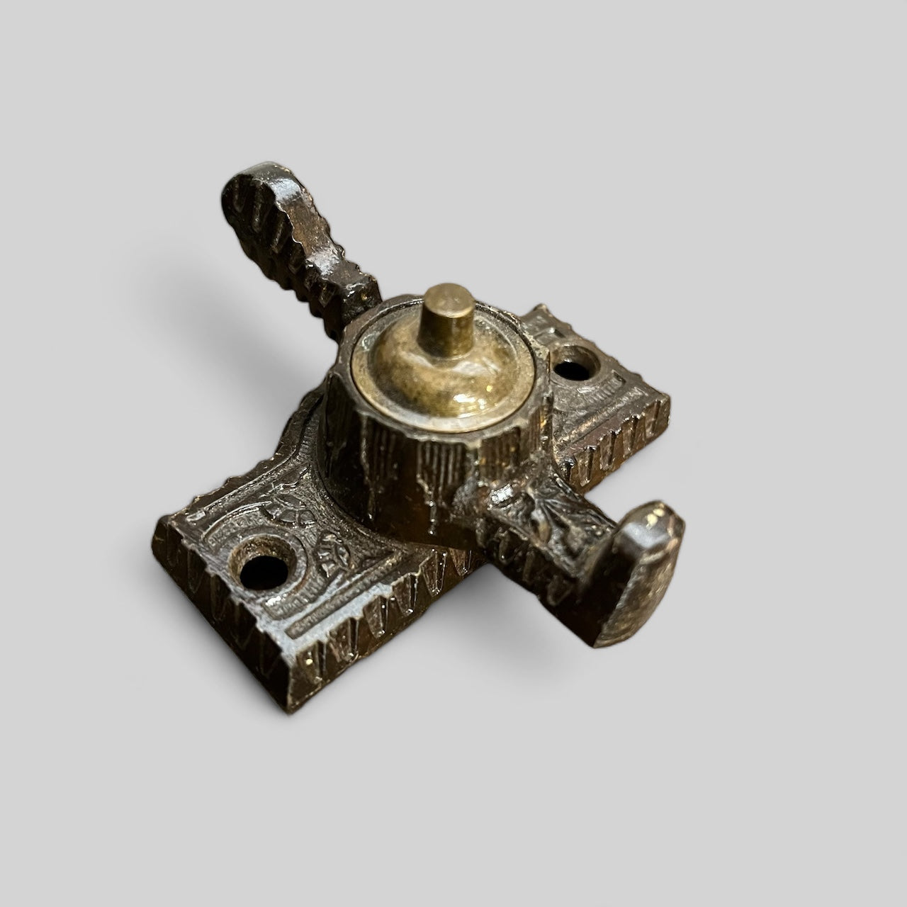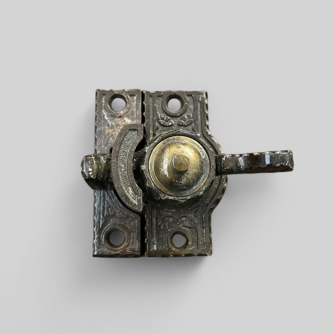 Antique ornate cast iron with brass accent window lock.