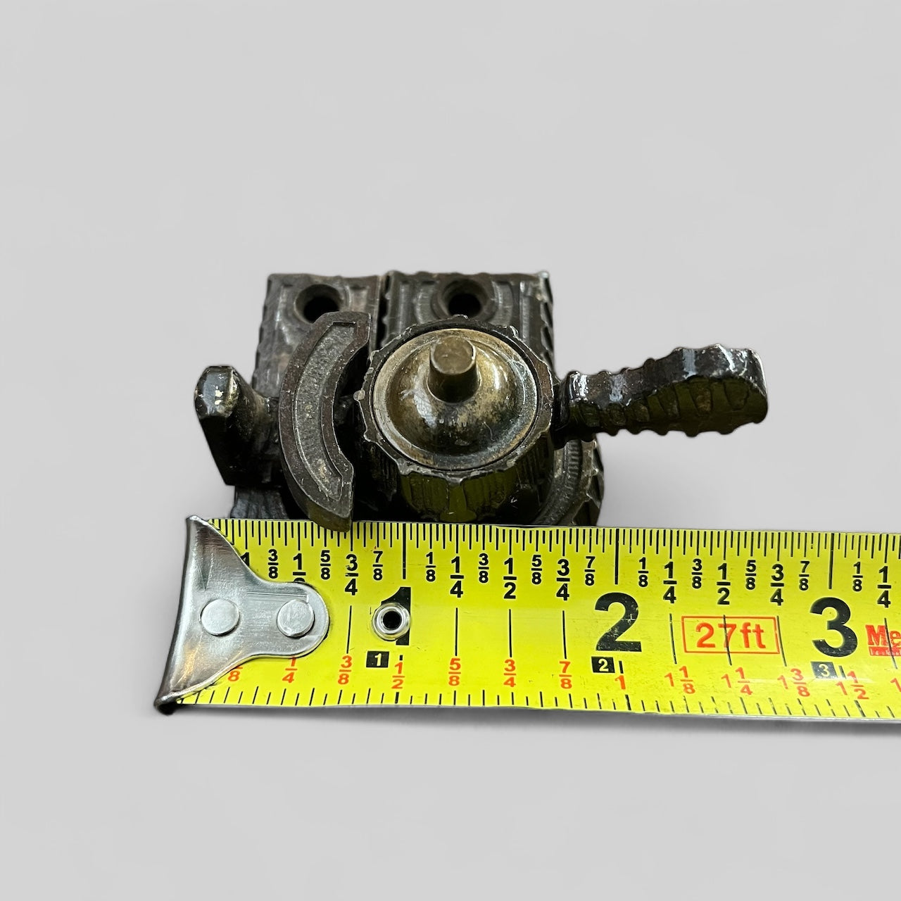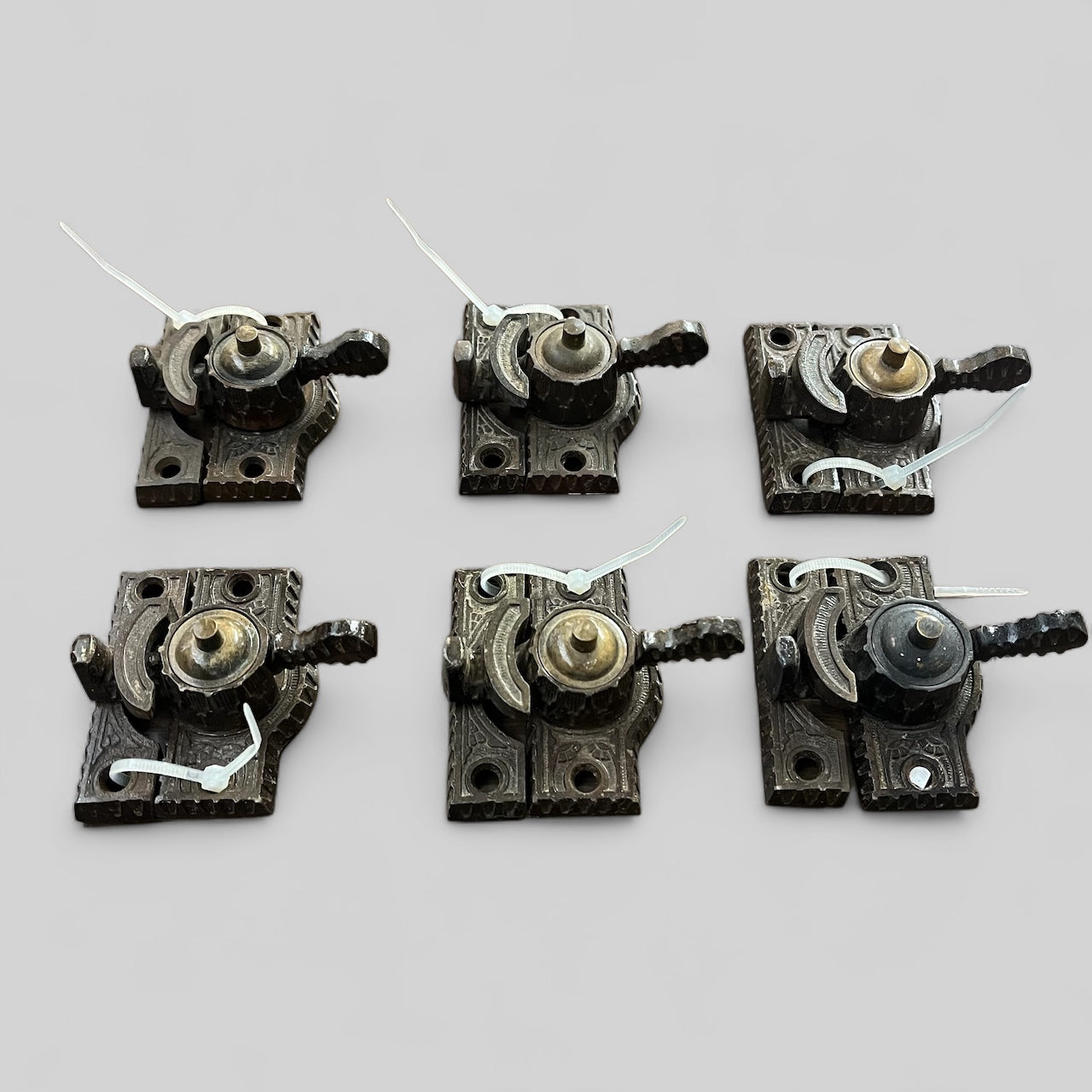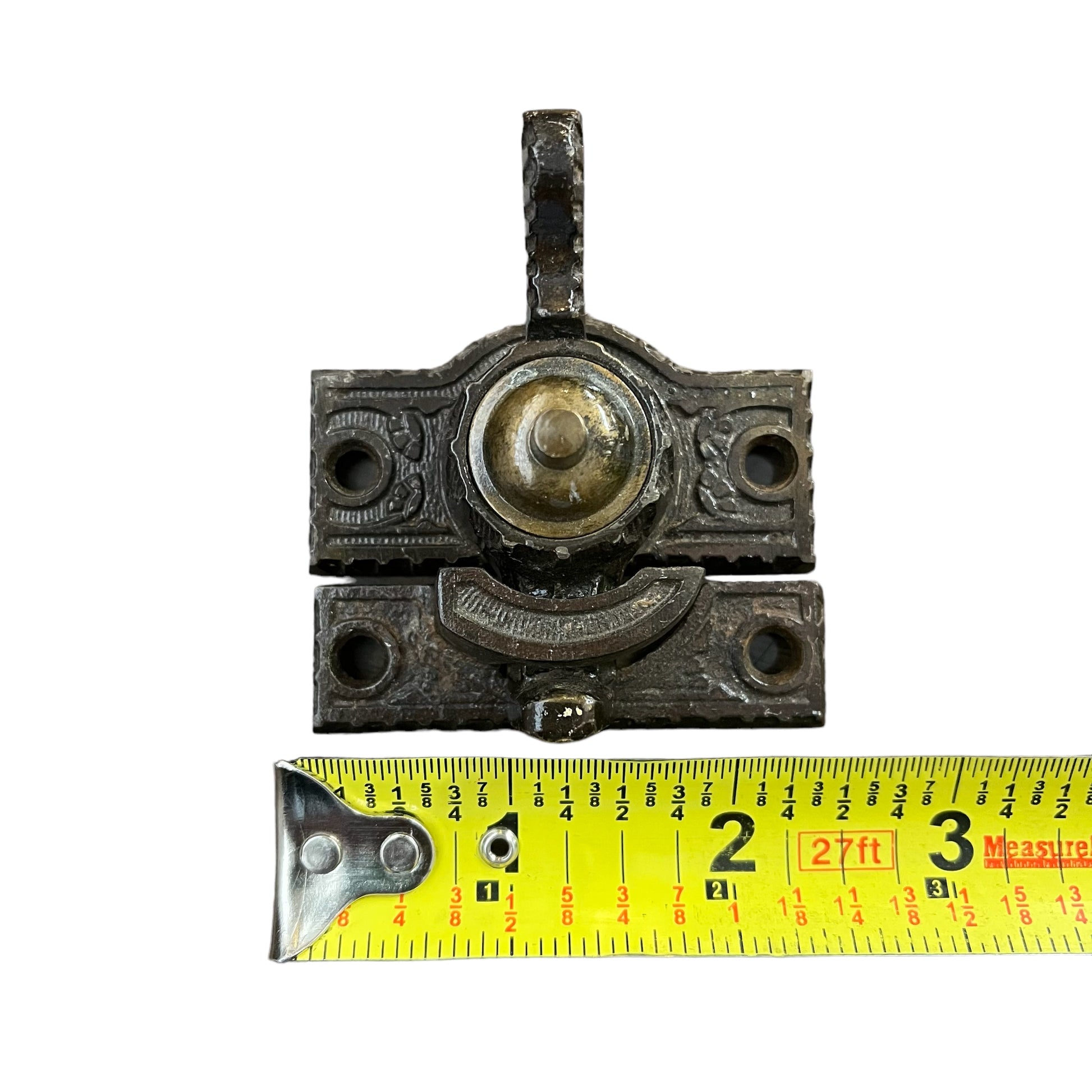 Antique ornate cast iron with brass accent window lock.