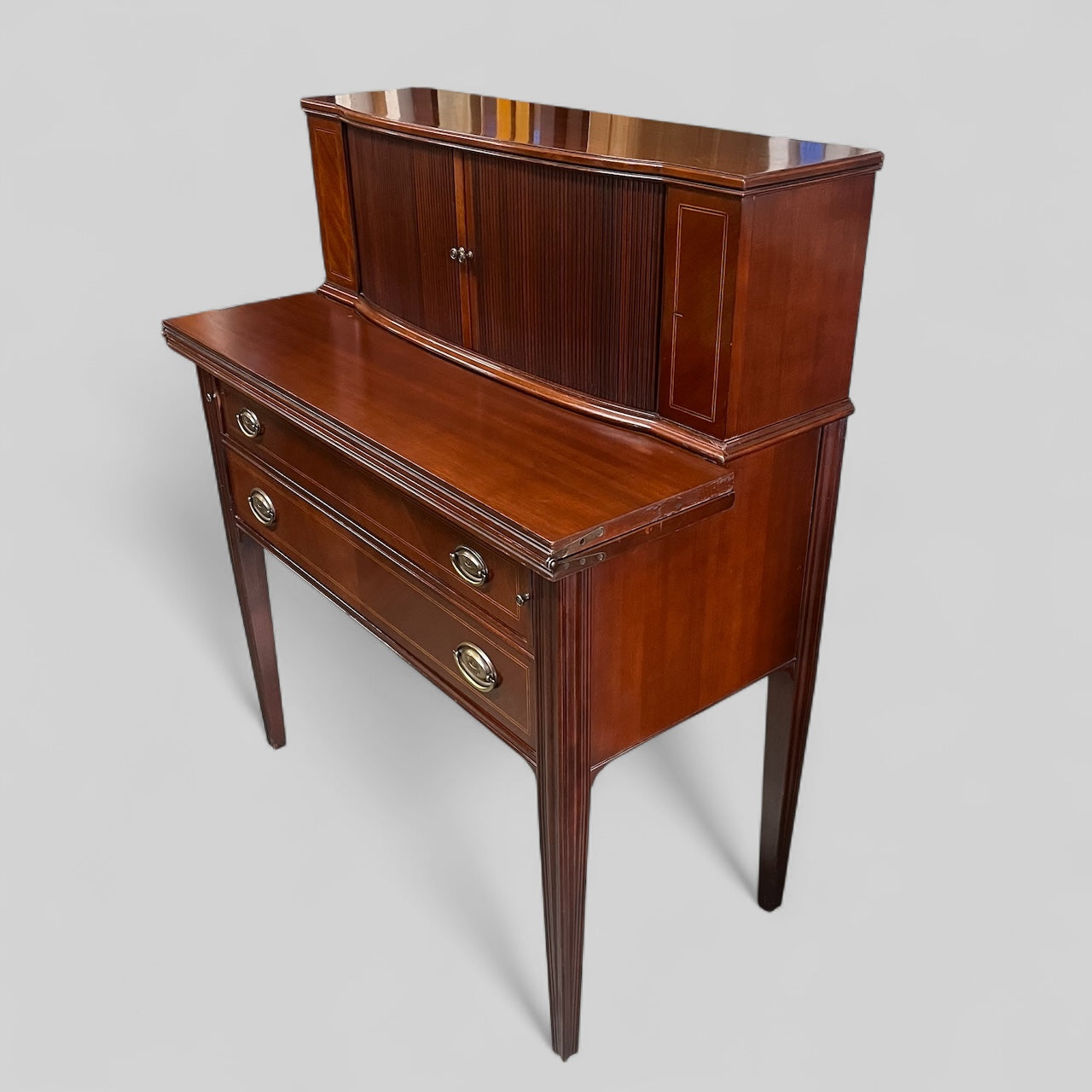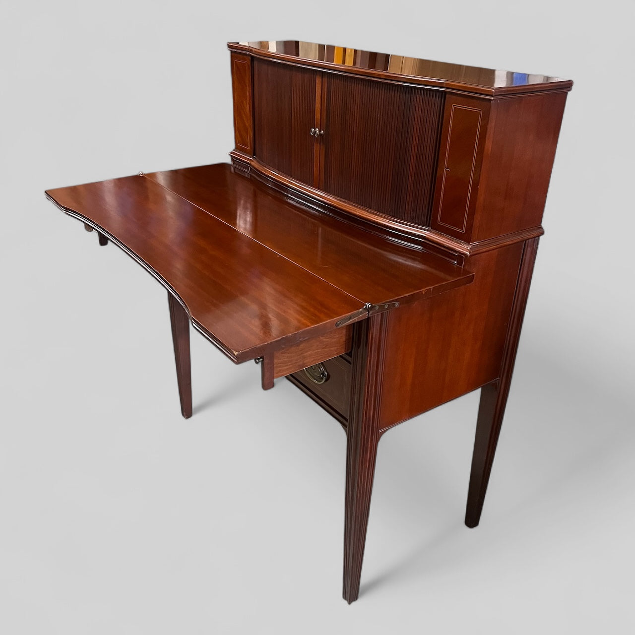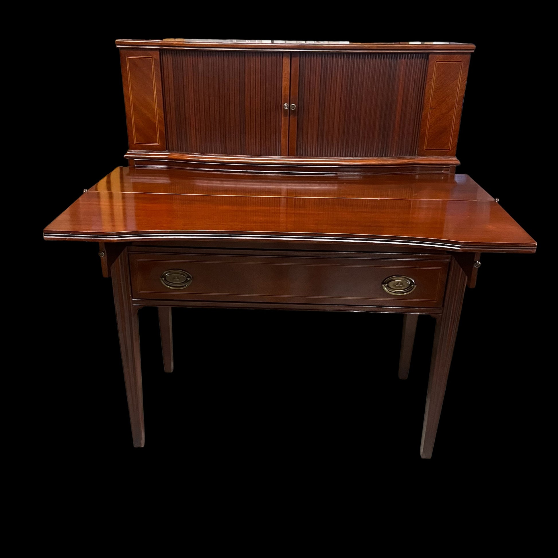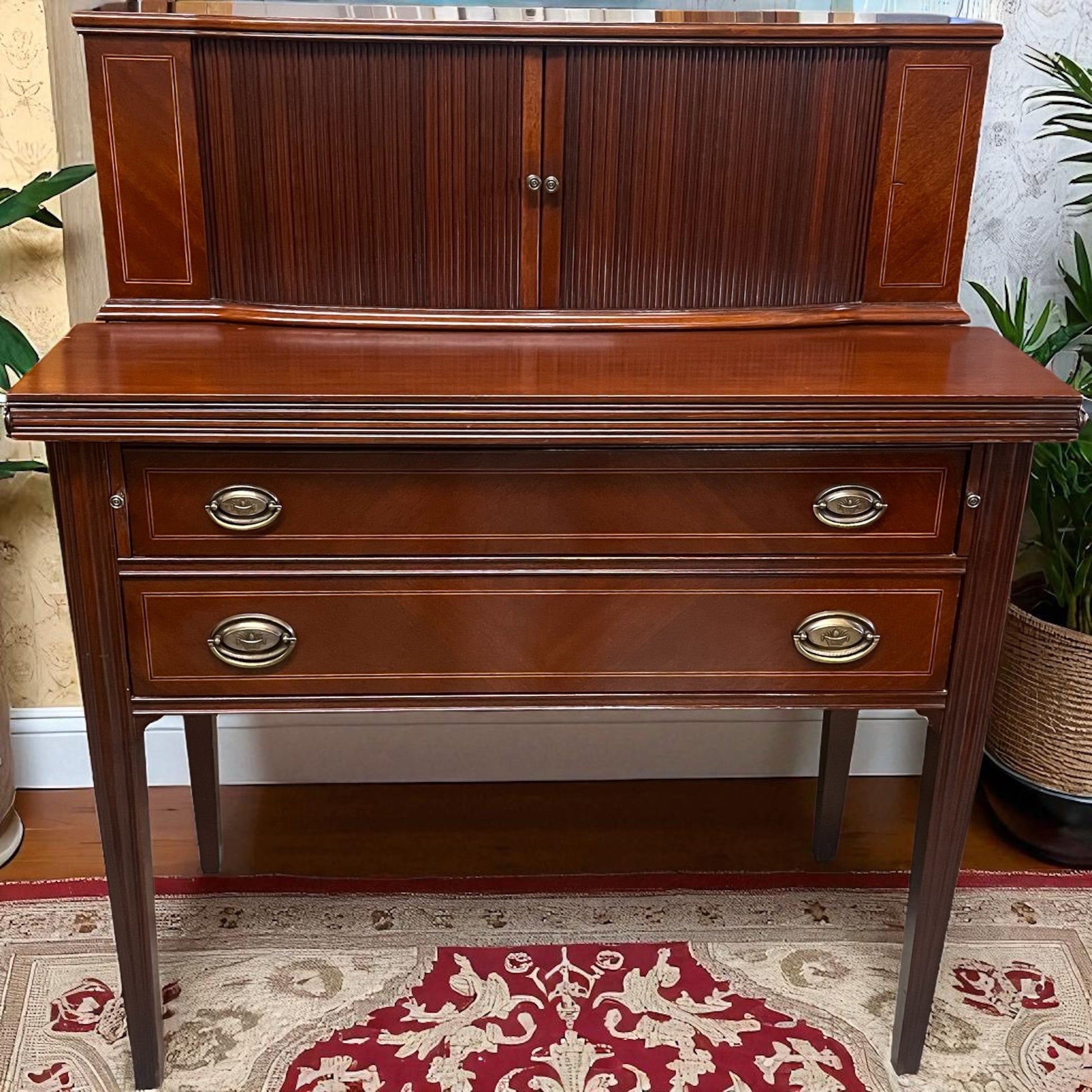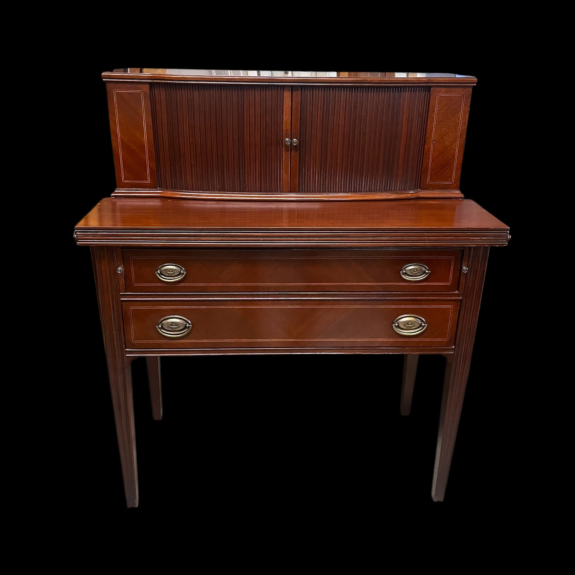 Stunning antique secretary desk crafted by The Wabash Co. (est. 1883) in Indiana. Designed in the timeless Federal style, it features two elegant tambour doors that reveal ample organizational compartments and a convenient fold-out writing surface.