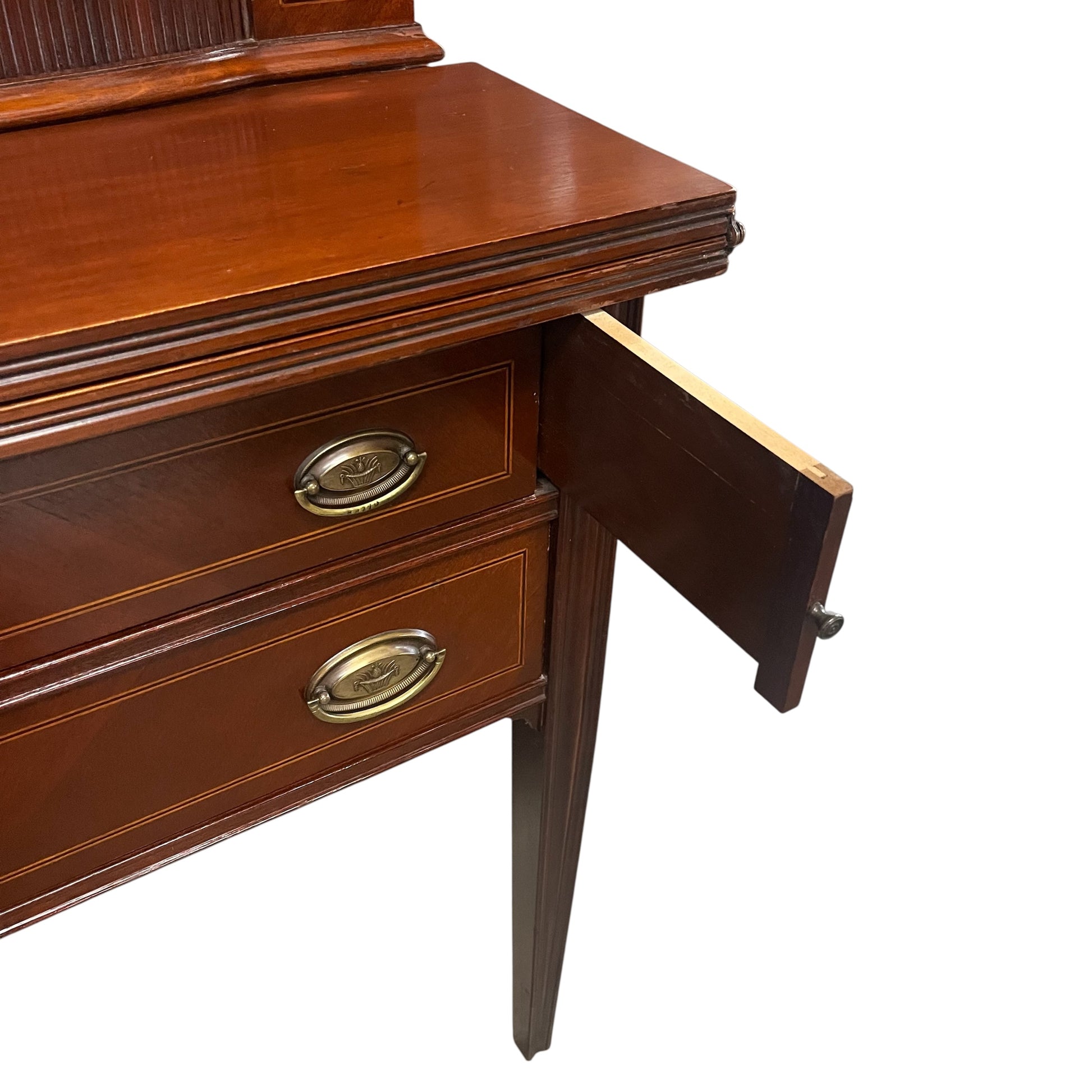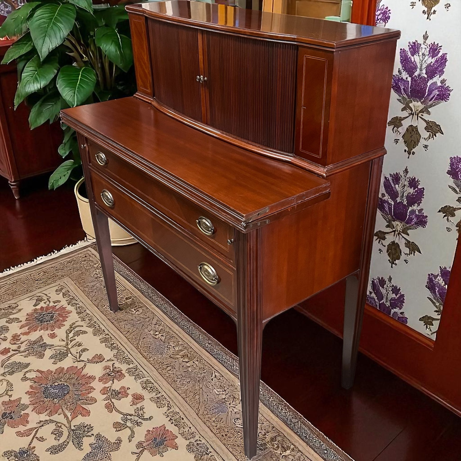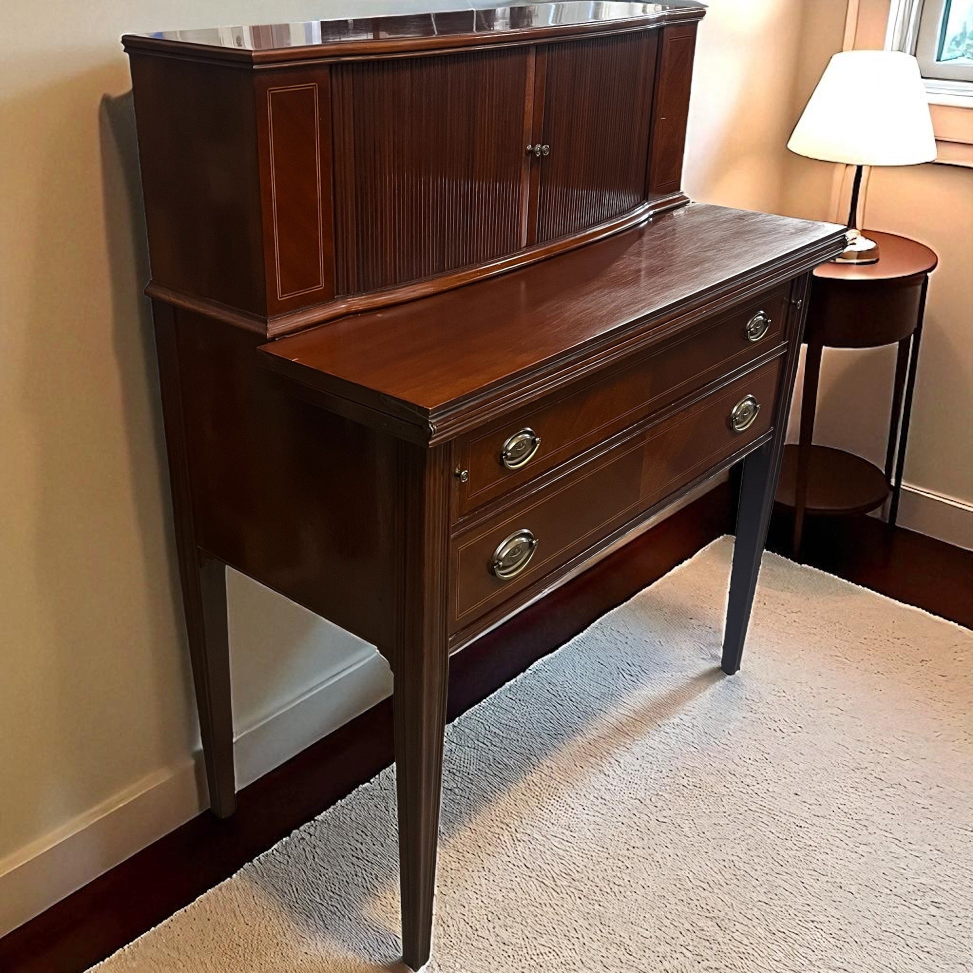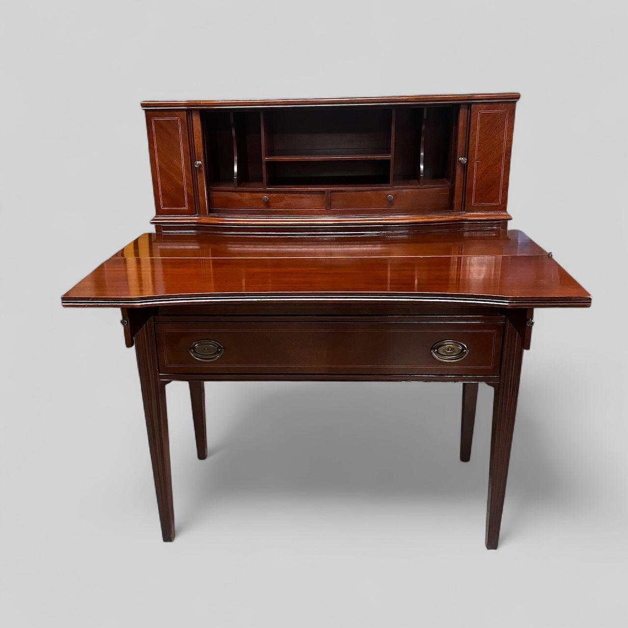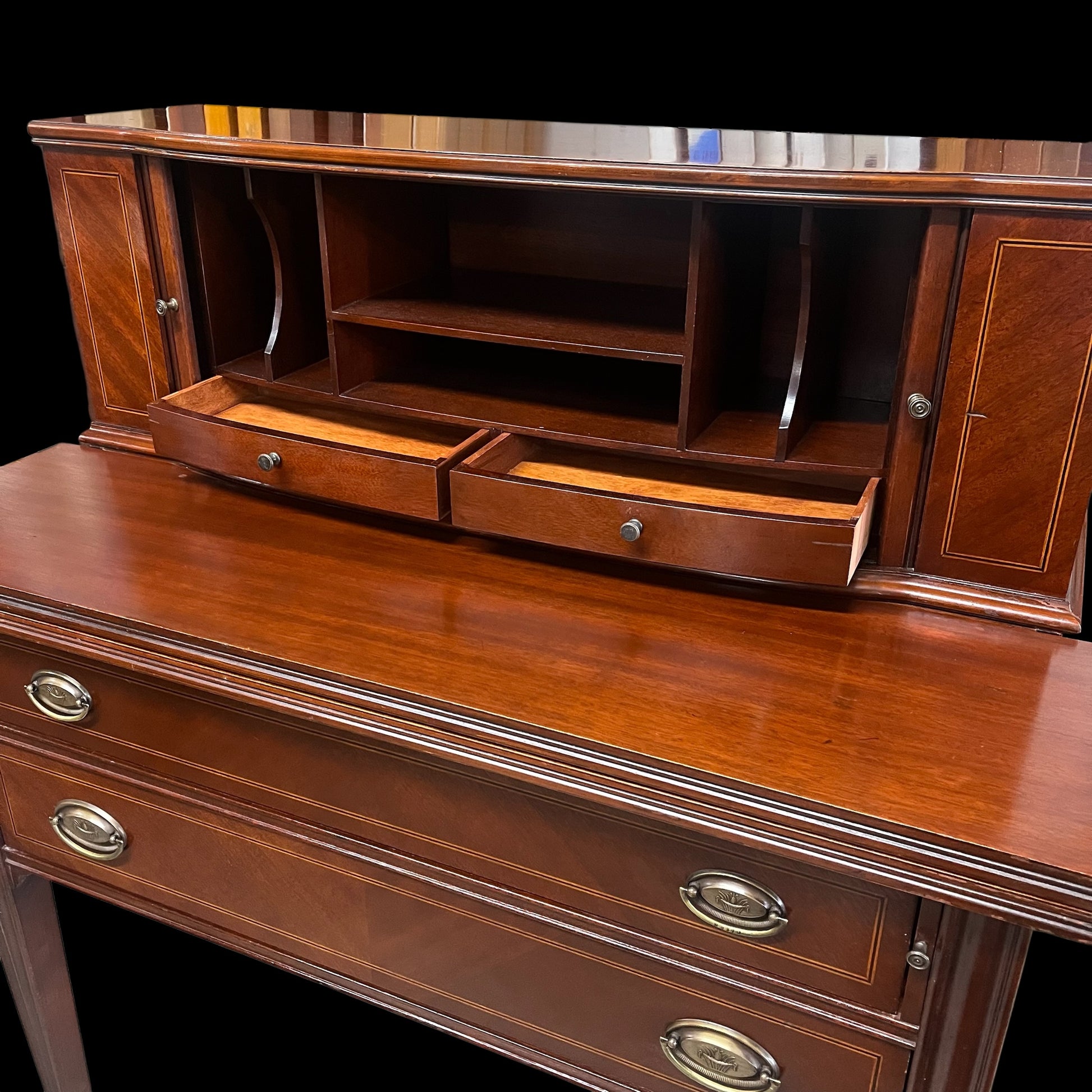 Stunning antique secretary desk crafted by The Wabash Co. (est. 1883) in Indiana. Designed in the timeless Federal style, it features two elegant tambour doors that reveal ample organizational compartments and a convenient fold-out writing surface.