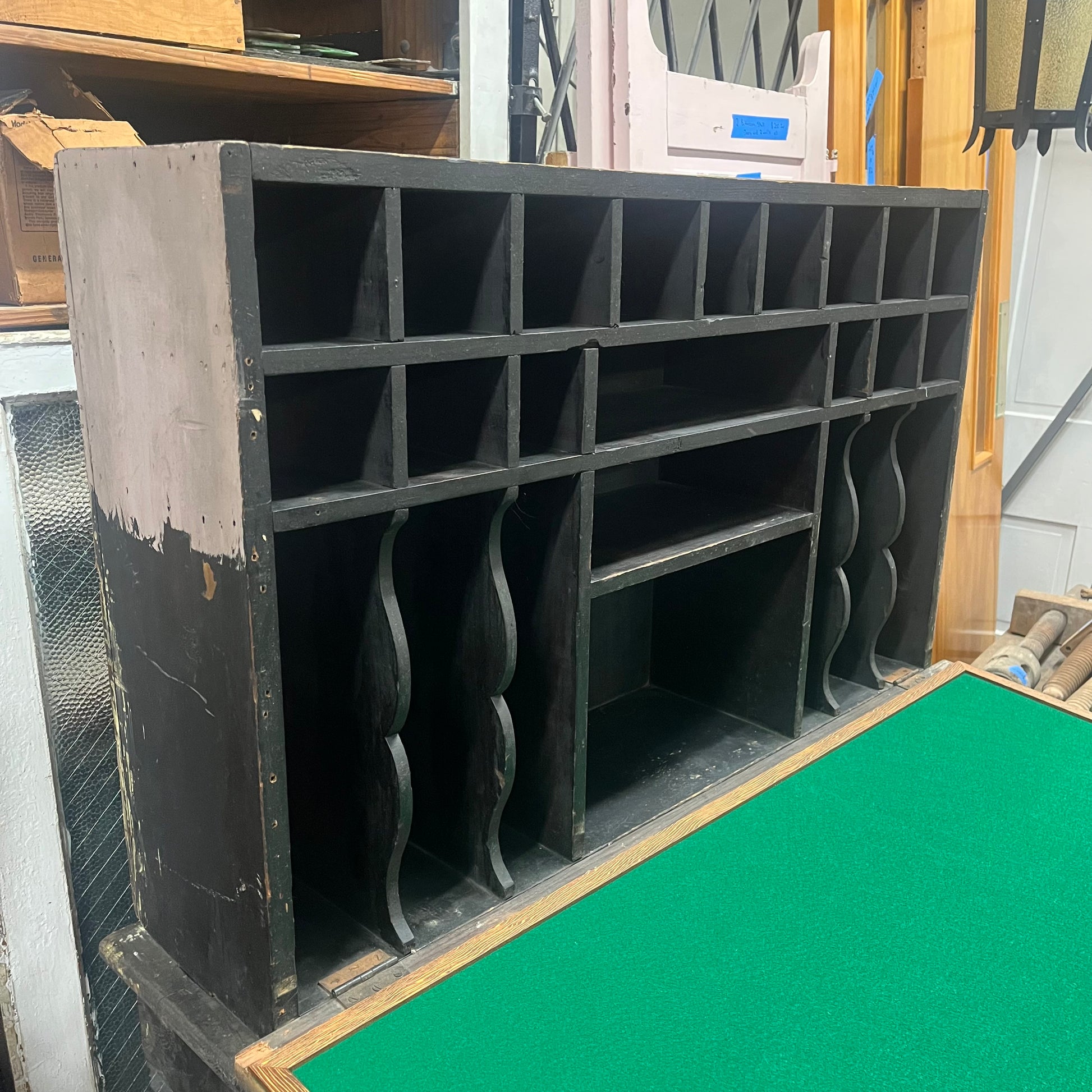 We’re certain this piece is pretty darn old, we’re just not entirely sure how old. Definitely late 1800s / early 1900s, or even possibly Civil War era (similar pieces are popping up with a google image search). In any case, this piece is really freaking cool! We replaced the green felt. I’d personally use it as an art desk. It would even be perfect for a puzzle enthusiast! So many possibilities!