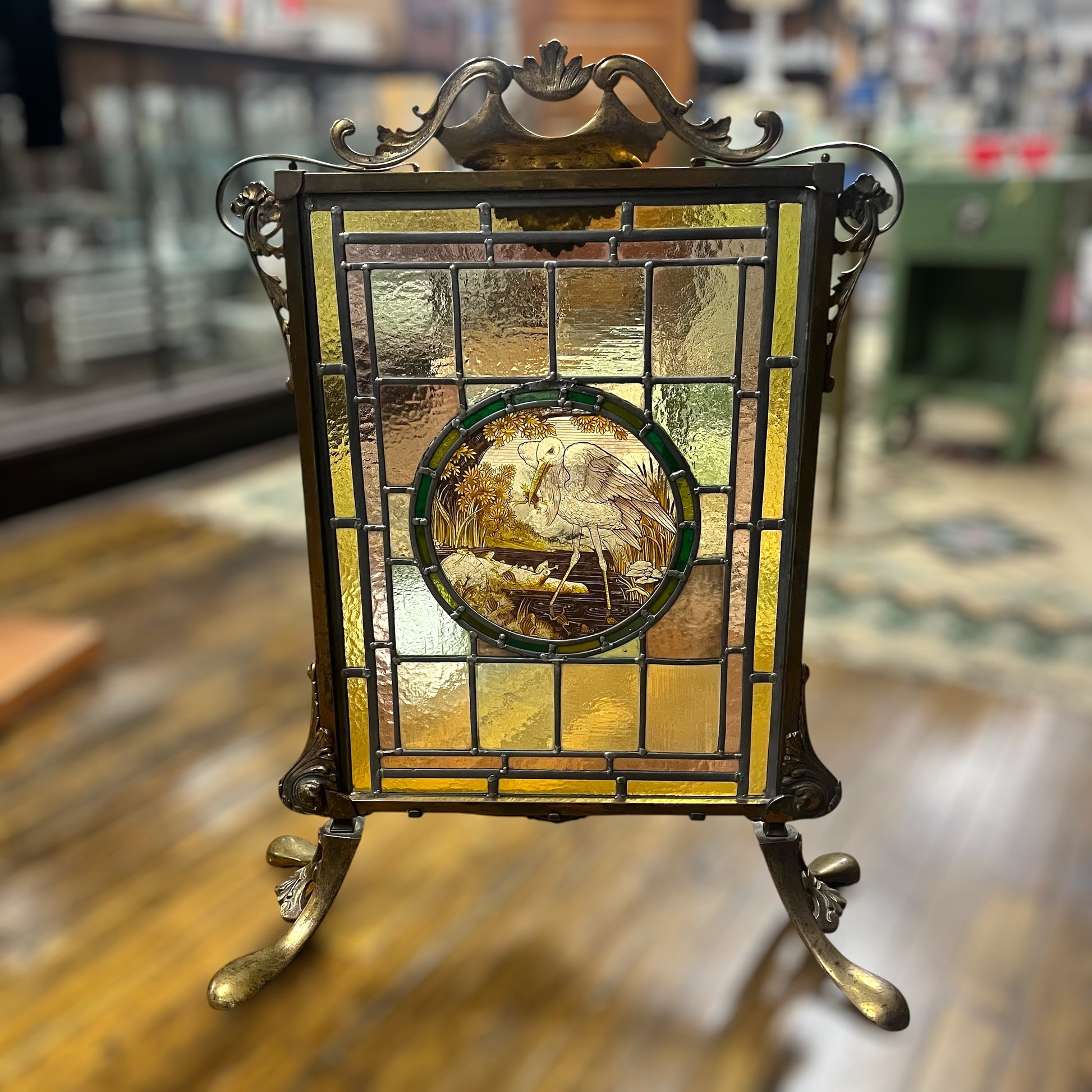 Antique Victorian Fireplace Screen With Stained Glass and Etched Center Piece
