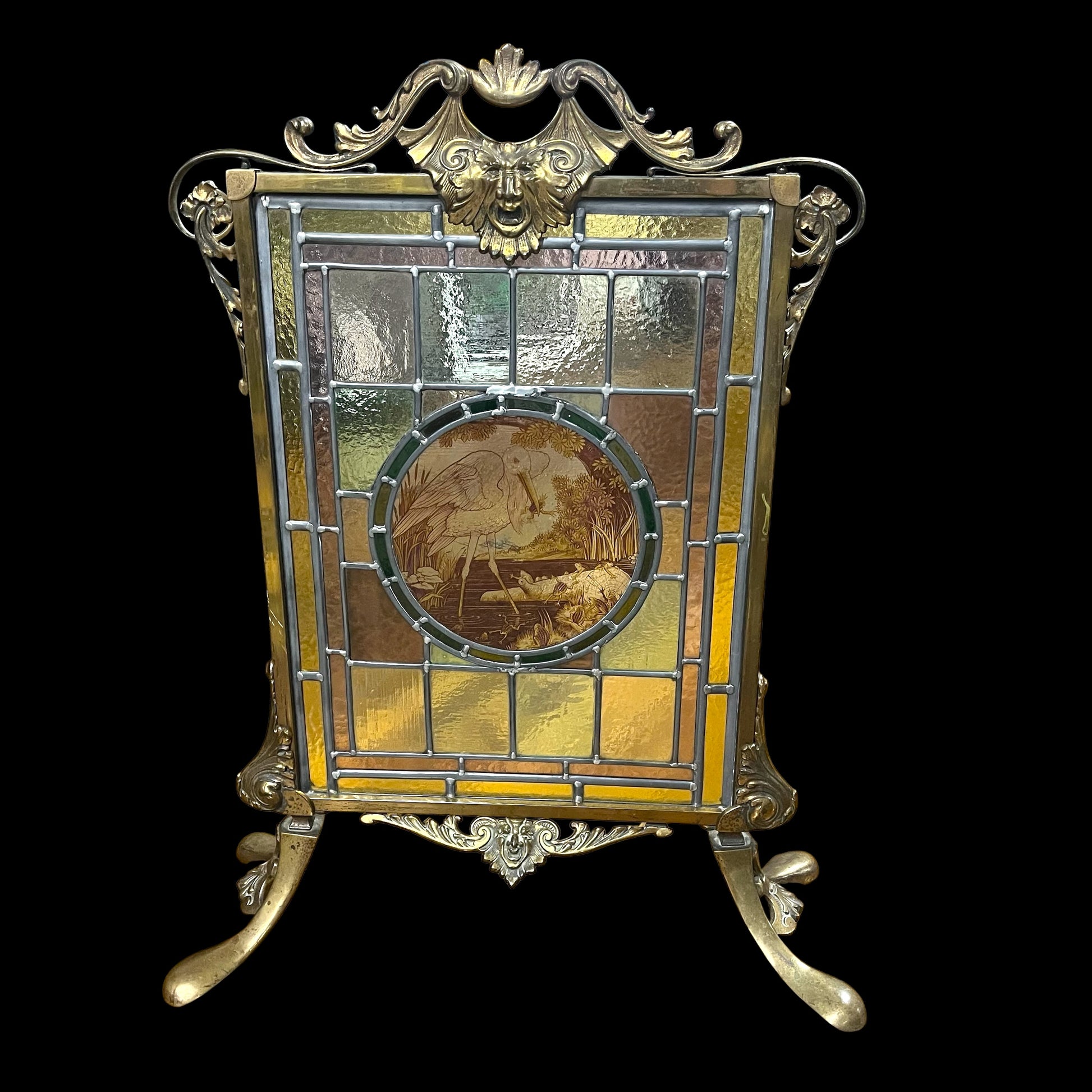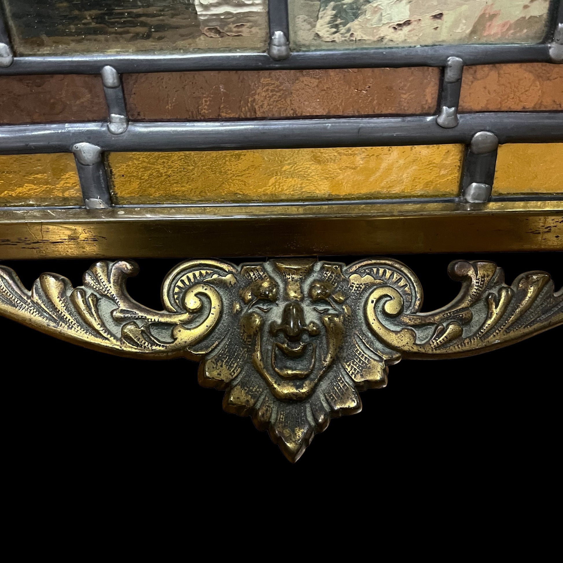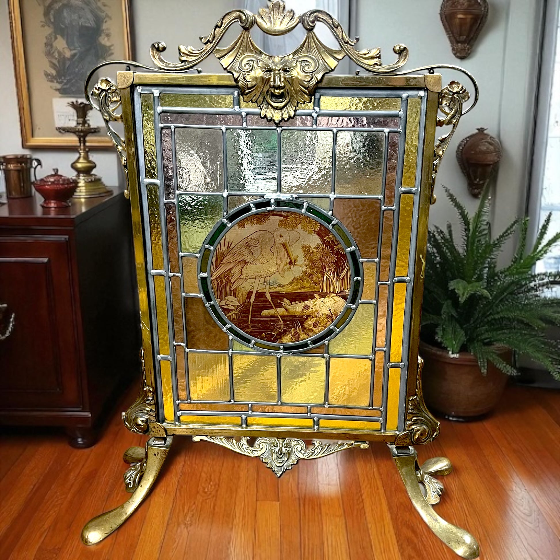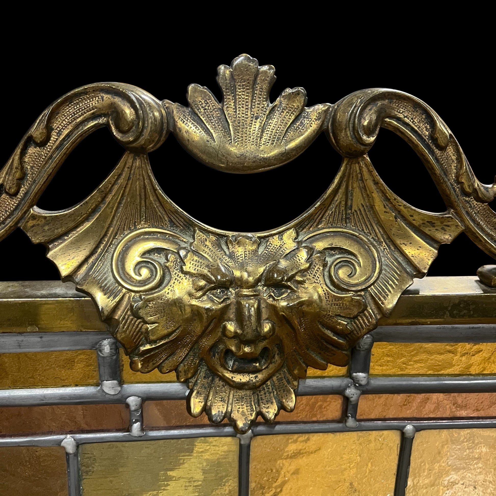 Absolutely stunning antique Victorian fireplace screen crafted with stained glass panels (no cracks and all intact) and solid brass. Its centerpiece showcases an intricately etched scene. The ornate frame is adorned with distinctive decorative elements, including the iconic greenman motif at both the top and bottom, and the base features elegantly scrolled feet, all reflecting the sophisticated design aesthetics characteristic of the late 19th to early 20th century.