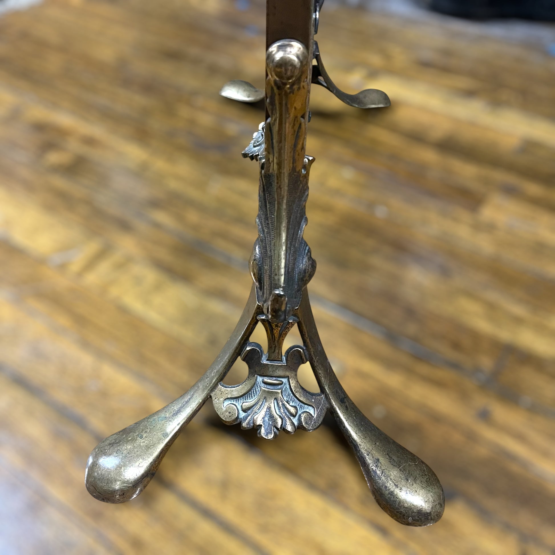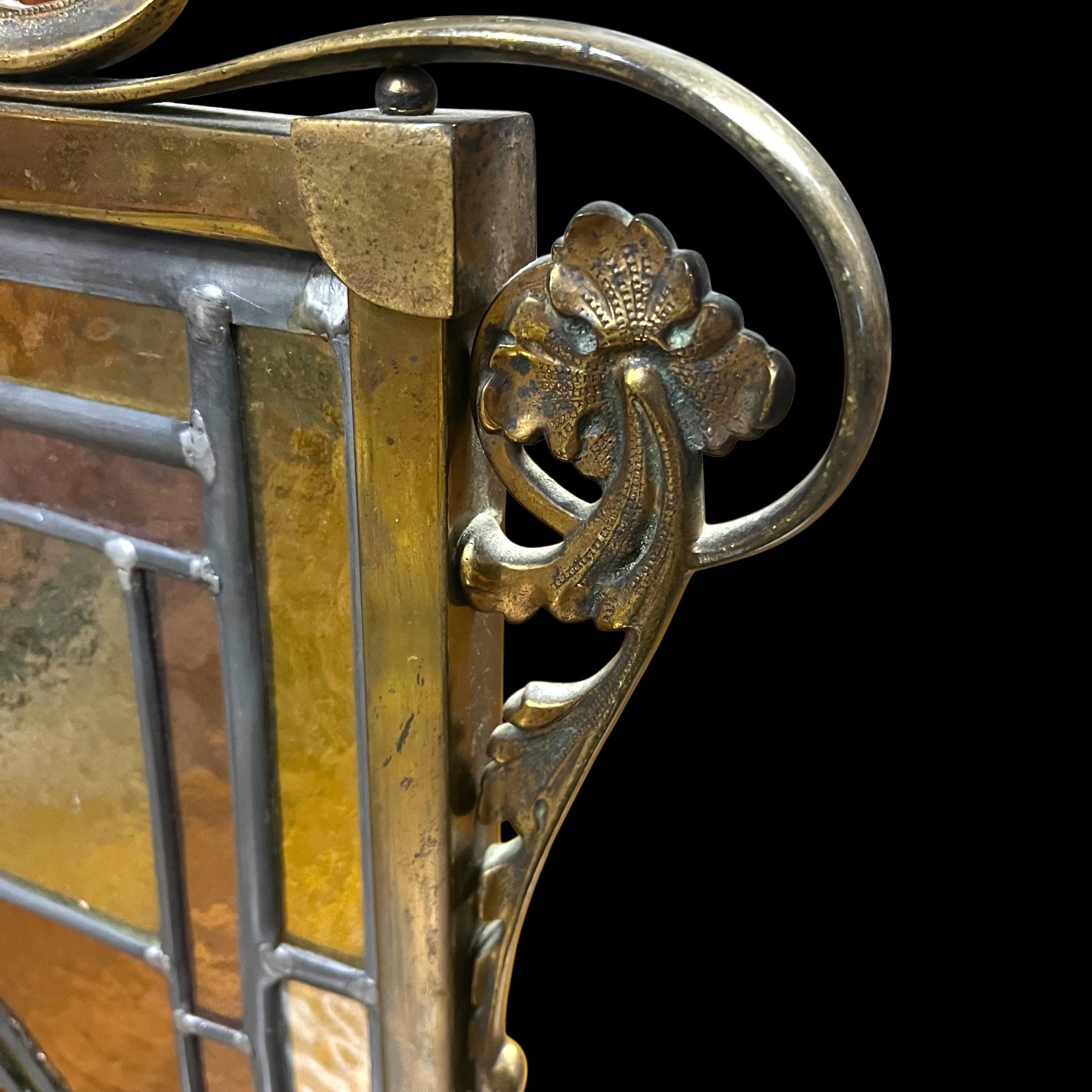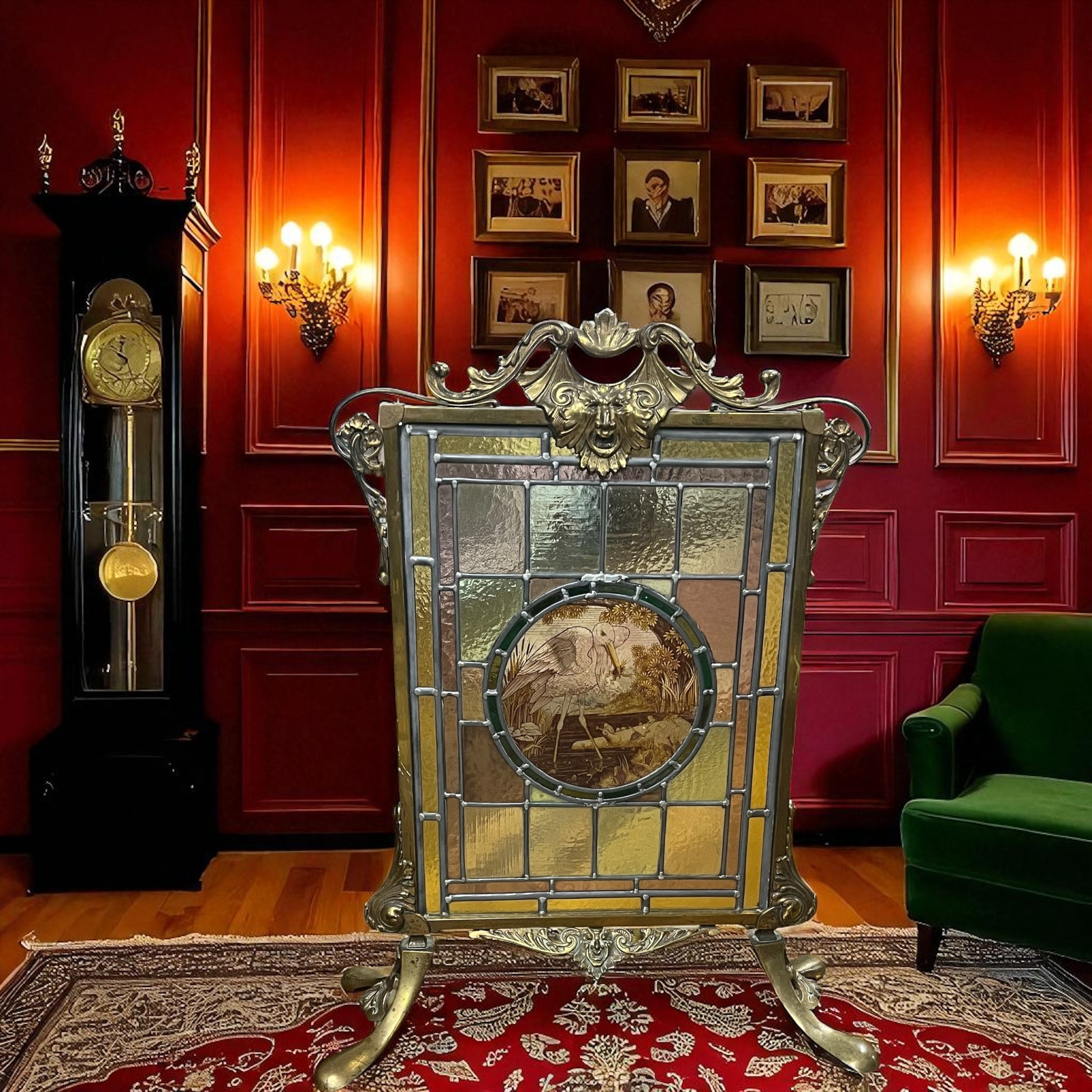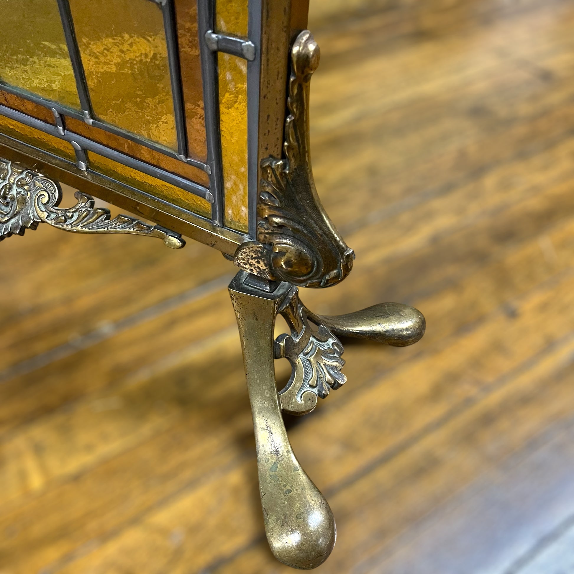 Absolutely stunning antique Victorian fireplace screen crafted with stained glass panels (no cracks and all intact) and solid brass. Its centerpiece showcases an intricately etched scene. The ornate frame is adorned with distinctive decorative elements, including the iconic greenman motif at both the top and bottom, and the base features elegantly scrolled feet, all reflecting the sophisticated design aesthetics characteristic of the late 19th to early 20th century.