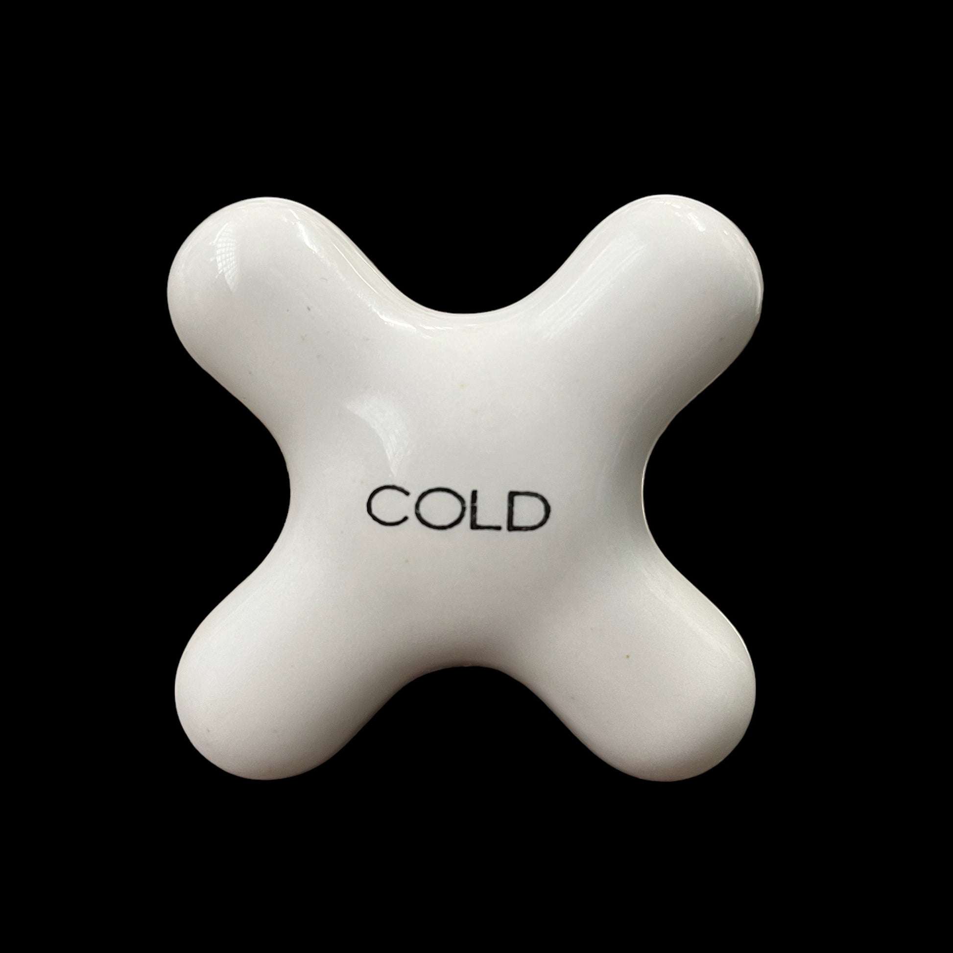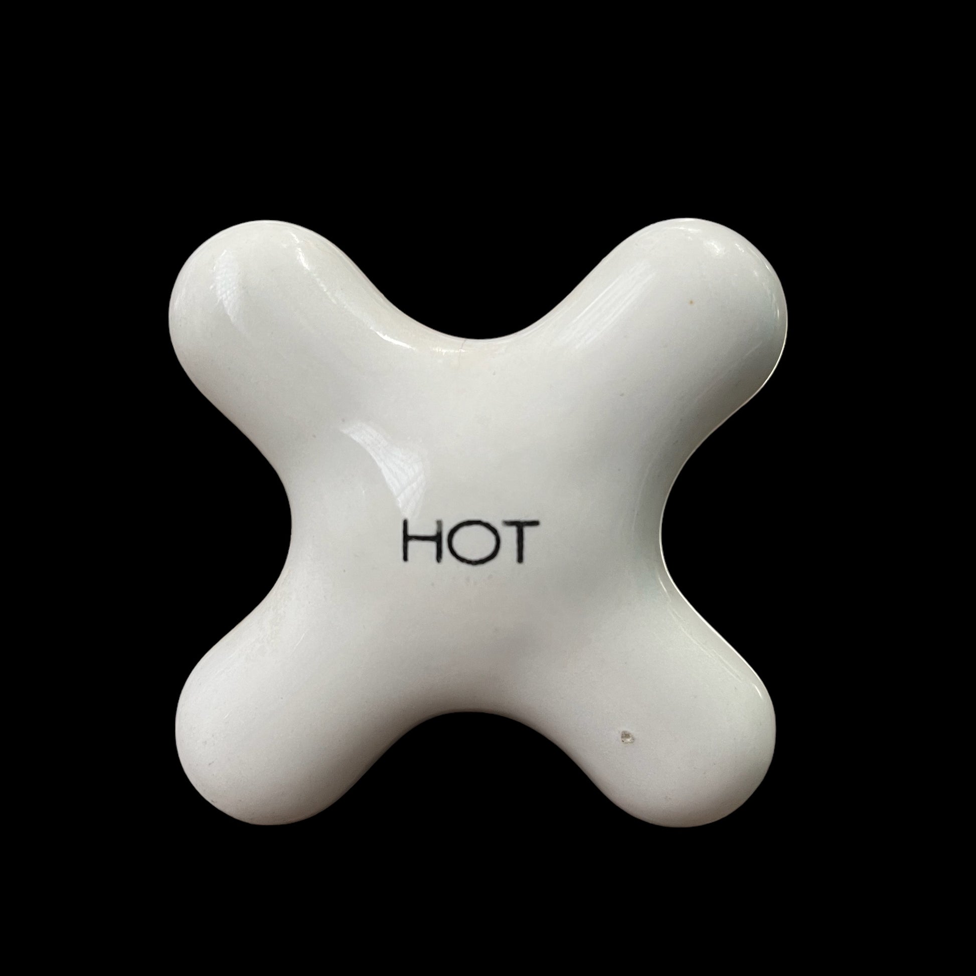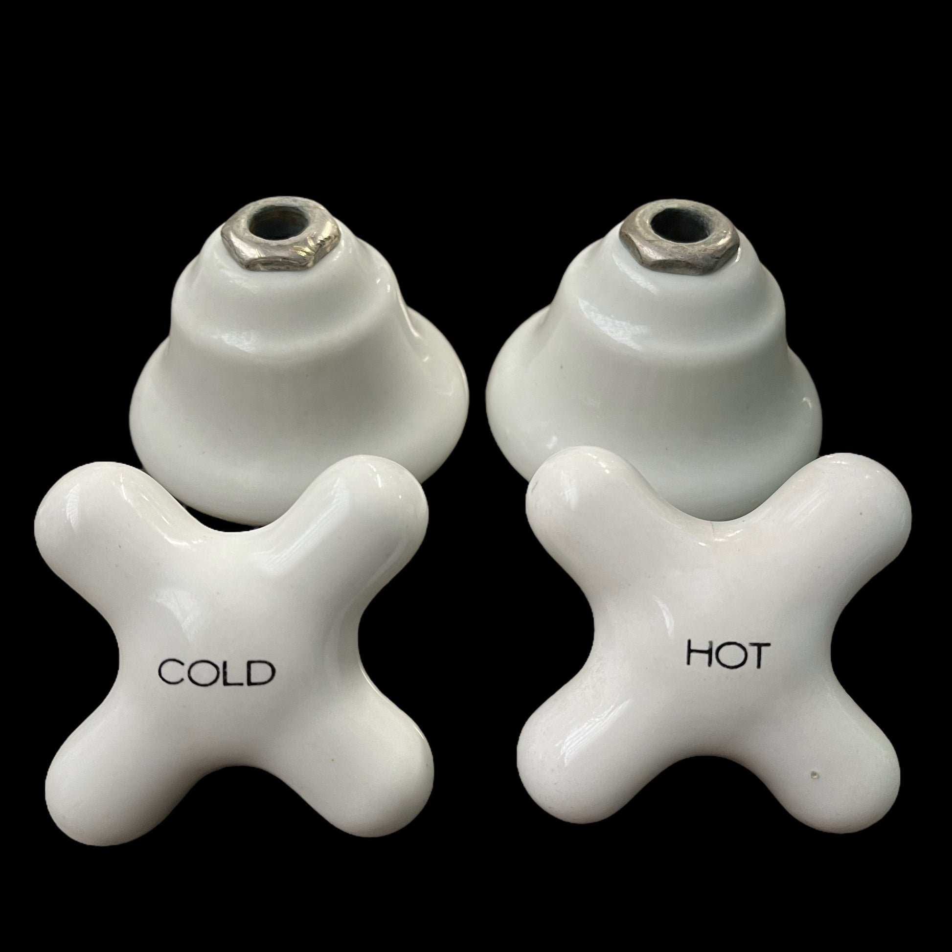 Antique (c. 1920) white porcelain COLD and HOT tub/shower faucet knobs with porcelain escutcheons. Set includes one COLD knob, one HOT knob, and two escutcheons.
