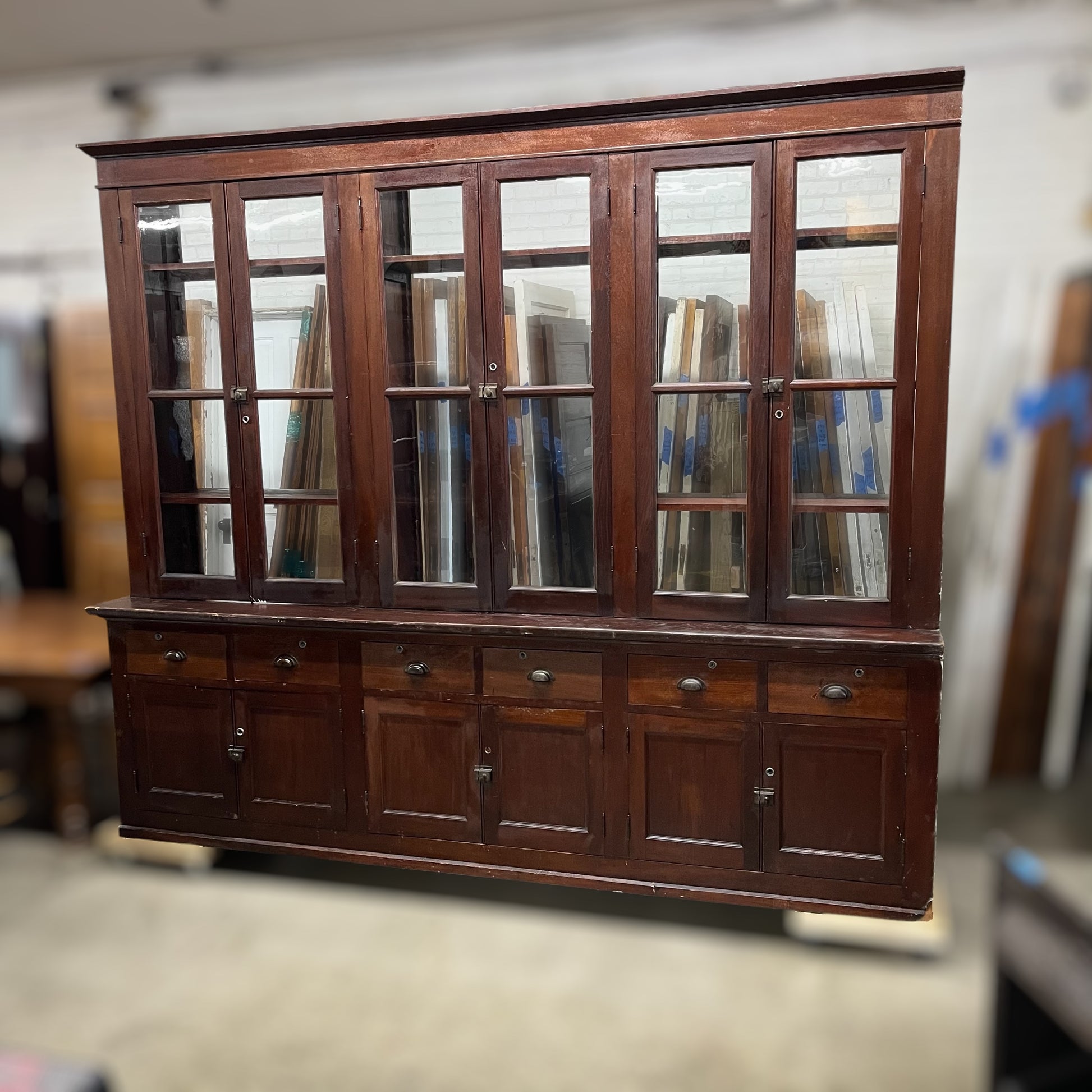 It’s been awhile since we’ve had such a large cabinet! This one is a beauty too! Originally from an early 1900s Church kitchen, has wavy glass and original hardware!