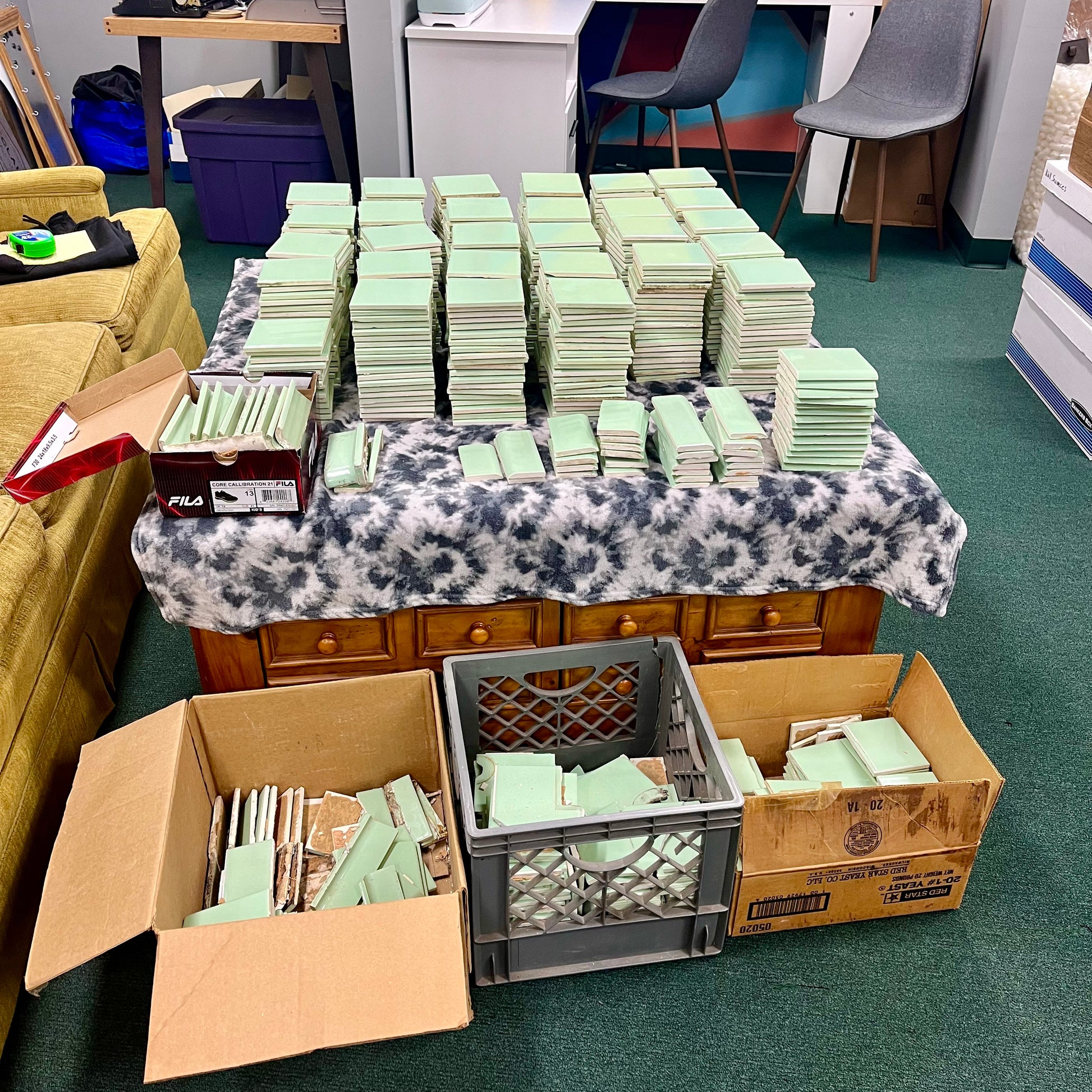 Large lot of mid-century ceramic tile. They’re either seafoam or mint green, it’s really hard to get a picture to capture their true color. The back of the tile say “WENCZEL 23”. The grout around the edges have been removed. There’s still adhesive on the back (see pic).