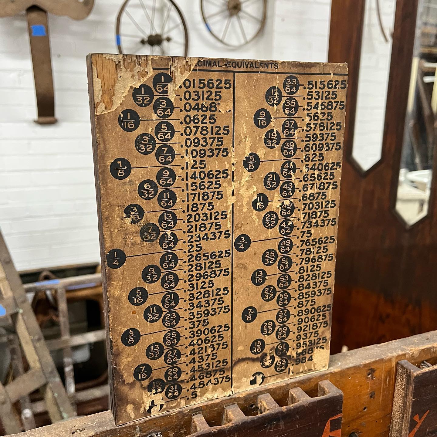 Vintage industrial pattern makers work bench with rare Oliver vise that tilts and rotates, and a conversion chart.