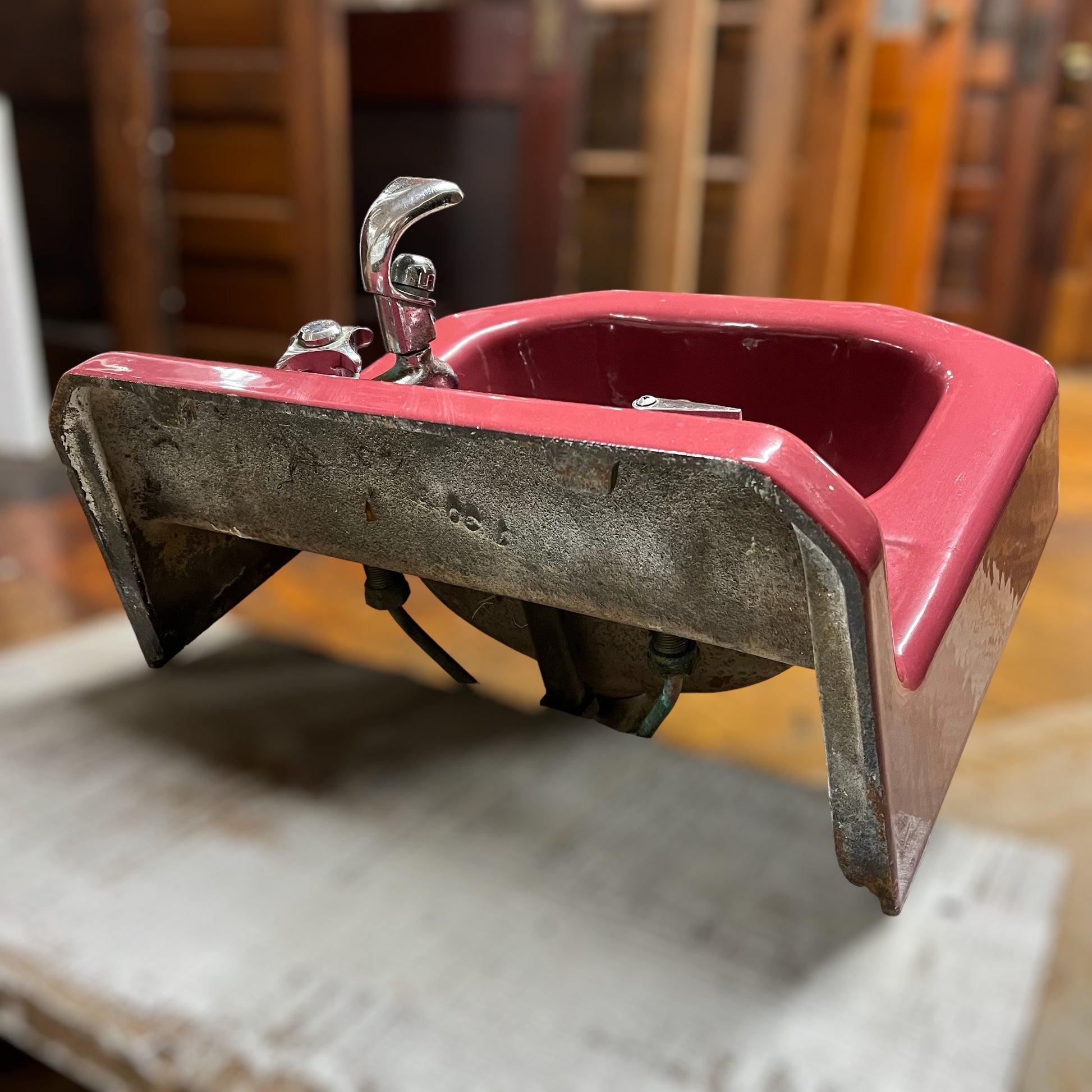 Vintage Mid-Century "Kohler" Burgundy Red Porcelain Enameled Cast Iron Wall Mount Sink. Nickel plated brass faucets. The nickel plating has worn of off the drinking fountain faucet. Untested - sold as is.